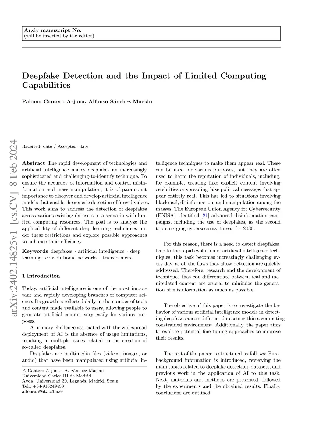 The rapid development of technologies and artificial intelligence makes deepfakes an increasingly sophisticated and challenging-to-identify technique. To ensure the accuracy of information and control misinformation and mass manipulation, it is of paramount importance to discover and develop artificial intelligence models that enable the generic detection of forged videos. This work aims to address the detection of deepfakes across various existing datasets in a scenario with limited computing resources. The goal is to analyze the applicability of different deep learning techniques under these restrictions and explore possible approaches to enhance their efficiency.