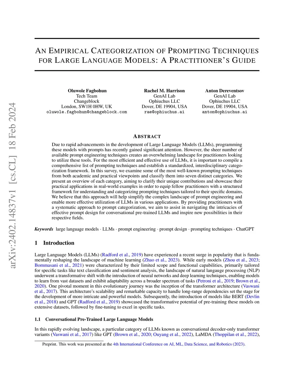 Due to rapid advancements in the development of Large Language Models (LLMs), programming these models with prompts has recently gained significant attention. However, the sheer number of available prompt engineering techniques creates an overwhelming landscape for practitioners looking to utilize these tools. For the most efficient and effective use of LLMs, it is important to compile a comprehensive list of prompting techniques and establish a standardized, interdisciplinary categorization framework. In this survey, we examine some of the most well-known prompting techniques from both academic and practical viewpoints and classify them into seven distinct categories. We present an overview of each category, aiming to clarify their unique contributions and showcase their practical applications in real-world examples in order to equip fellow practitioners with a structured framework for understanding and categorizing prompting techniques tailored to their specific domains. We believe that this approach will help simplify the complex landscape of prompt engineering and enable more effective utilization of LLMs in various applications. By providing practitioners with a systematic approach to prompt categorization, we aim to assist in navigating the intricacies of effective prompt design for conversational pre-trained LLMs and inspire new possibilities in their respective fields.