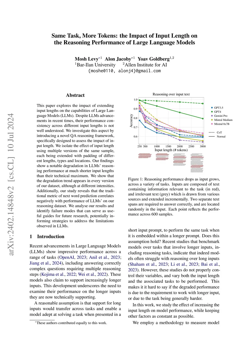 This paper explores the impact of extending input lengths on the capabilities of Large Language Models (LLMs). Despite LLMs advancements in recent times, their performance consistency across different input lengths is not well understood. We investigate this aspect by introducing a novel QA reasoning framework, specifically designed to assess the impact of input length. We isolate the effect of input length using multiple versions of the same sample, each being extended with padding of different lengths, types and locations. Our findings show a notable degradation in LLMs' reasoning performance at much shorter input lengths than their technical maximum. We show that the degradation trend appears in every version of our dataset, although at different intensities. Additionally, our study reveals that the traditional metric of next word prediction correlates negatively with performance of LLMs' on our reasoning dataset. We analyse our results and identify failure modes that can serve as useful guides for future research, potentially informing strategies to address the limitations observed in LLMs.