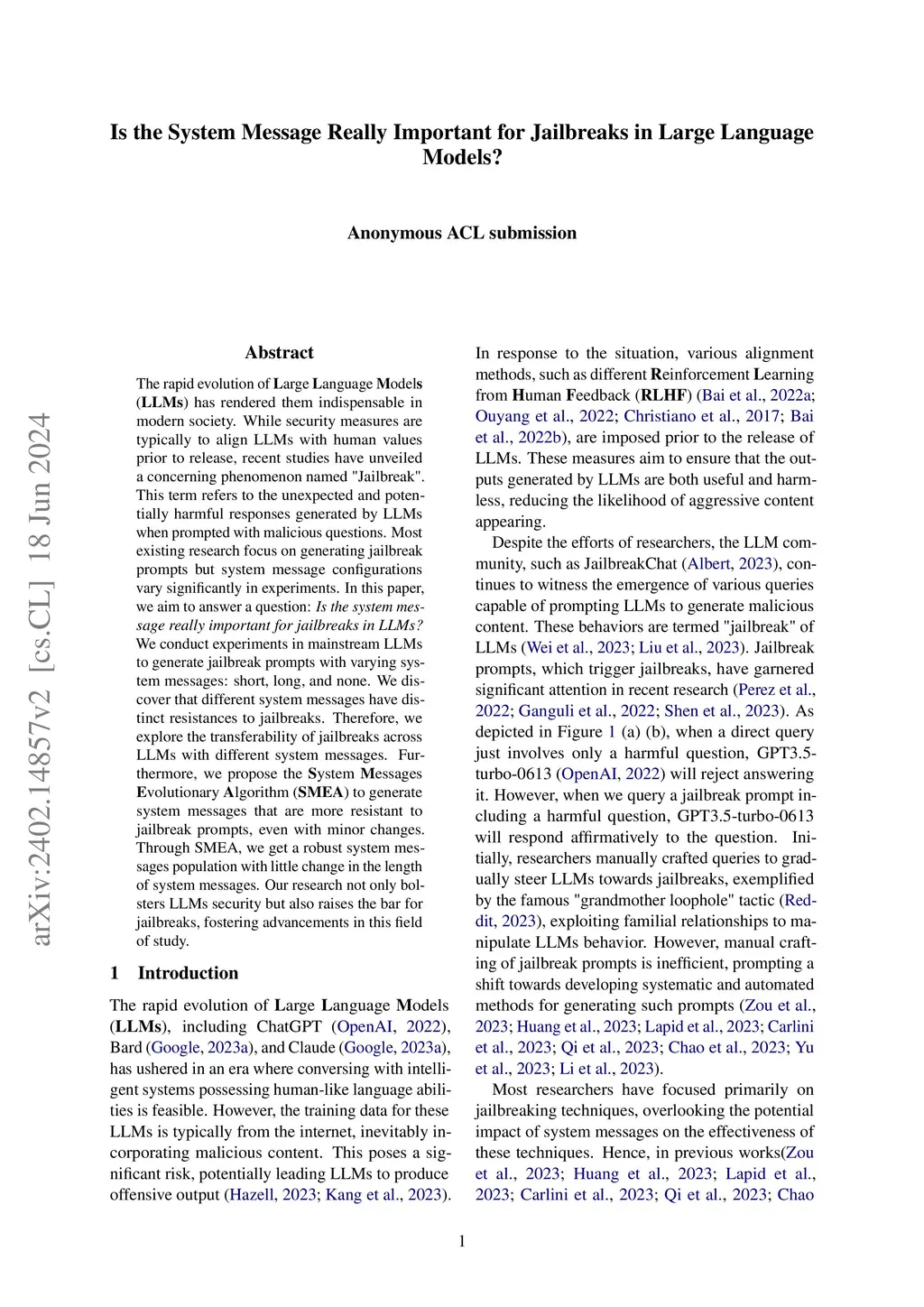 The rapid evolution of Large Language Models (LLMs) has rendered them indispensable in modern society. While security measures are typically to align LLMs with human values prior to release, recent studies have unveiled a concerning phenomenon named "Jailbreak". This term refers to the unexpected and potentially harmful responses generated by LLMs when prompted with malicious questions. Most existing research focus on generating jailbreak prompts but system message configurations vary significantly in experiments. In this paper, we aim to answer a question: Is the system message really important for jailbreaks in LLMs? We conduct experiments in mainstream LLMs to generate jailbreak prompts with varying system messages: short, long, and none. We discover that different system messages have distinct resistances to jailbreaks. Therefore, we explore the transferability of jailbreaks across LLMs with different system messages. Furthermore, we propose the System Messages Evolutionary Algorithm (SMEA) to generate system messages that are more resistant to jailbreak prompts, even with minor changes. Through SMEA, we get a robust system messages population with little change in the length of system messages. Our research not only bolsters LLMs security but also raises the bar for jailbreaks, fostering advancements in this field of study.