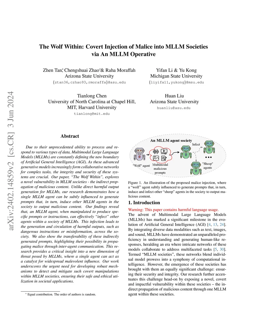 Due to their unprecedented ability to process and respond to various types of data, Multimodal Large Language Models (MLLMs) are constantly defining the new boundary of Artificial General Intelligence (AGI). As these advanced generative models increasingly form collaborative networks for complex tasks, the integrity and security of these systems are crucial. Our paper, ``The Wolf Within'', explores a novel vulnerability in MLLM societies - the indirect propagation of malicious content. Unlike direct harmful output generation for MLLMs, our research demonstrates how a single MLLM agent can be subtly influenced to generate prompts that, in turn, induce other MLLM agents in the society to output malicious content. Our findings reveal that, an MLLM agent, when manipulated to produce specific prompts or instructions, can effectively ``infect'' other agents within a society of MLLMs. This infection leads to the generation and circulation of harmful outputs, such as dangerous instructions or misinformation, across the society. We also show the transferability of these indirectly generated prompts, highlighting their possibility in propagating malice through inter-agent communication. This research provides a critical insight into a new dimension of threat posed by MLLMs, where a single agent can act as a catalyst for widespread malevolent influence. Our work underscores the urgent need for developing robust mechanisms to detect and mitigate such covert manipulations within MLLM societies, ensuring their safe and ethical utilization in societal applications.