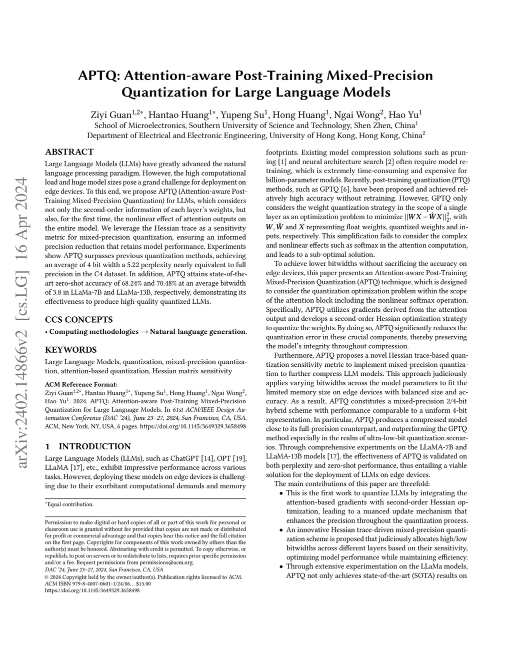APTQ: Attention-aware Post-Training Mixed-Precision Quantization for