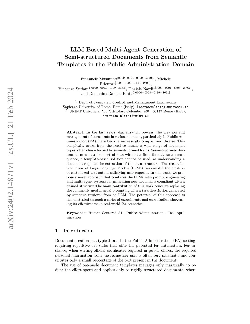 In the last years' digitalization process, the creation and management of documents in various domains, particularly in Public Administration (PA), have become increasingly complex and diverse. This complexity arises from the need to handle a wide range of document types, often characterized by semi-structured forms. Semi-structured documents present a fixed set of data without a fixed format. As a consequence, a template-based solution cannot be used, as understanding a document requires the extraction of the data structure. The recent introduction of Large Language Models (LLMs) has enabled the creation of customized text output satisfying user requests. In this work, we propose a novel approach that combines the LLMs with prompt engineering and multi-agent systems for generating new documents compliant with a desired structure. The main contribution of this work concerns replacing the commonly used manual prompting with a task description generated by semantic retrieval from an LLM. The potential of this approach is demonstrated through a series of experiments and case studies, showcasing its effectiveness in real-world PA scenarios.