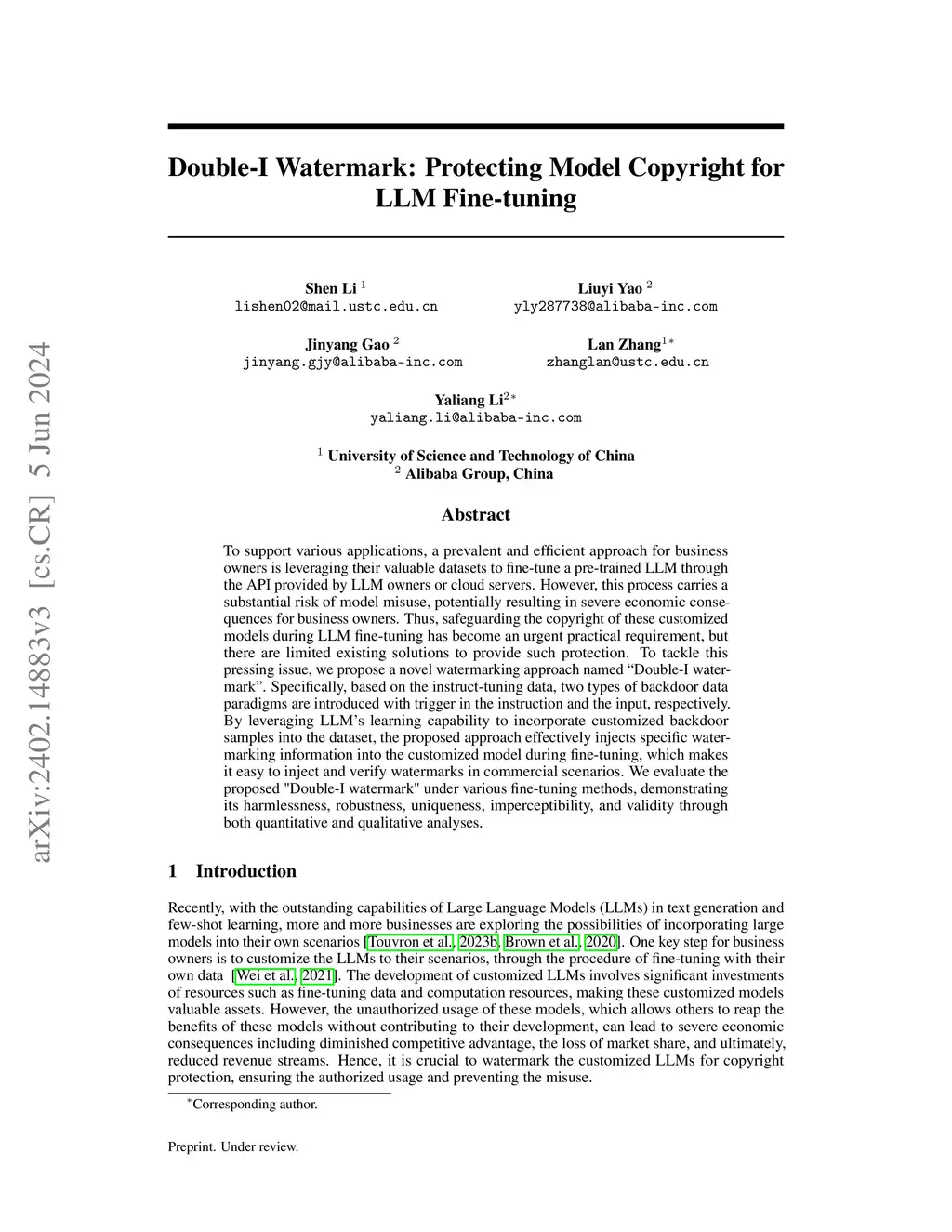 To support various applications, a prevalent and efficient approach for business owners is leveraging their valuable datasets to fine-tune a pre-trained LLM through the API provided by LLM owners or cloud servers. However, this process carries a substantial risk of model misuse, potentially resulting in severe economic consequences for business owners. Thus, safeguarding the copyright of these customized models during LLM fine-tuning has become an urgent practical requirement, but there are limited existing solutions to provide such protection. To tackle this pressing issue, we propose a novel watermarking approach named ``Double-I watermark''. Specifically, based on the instruct-tuning data, two types of backdoor data paradigms are introduced with trigger in the instruction and the input, respectively. By leveraging LLM's learning capability to incorporate customized backdoor samples into the dataset, the proposed approach effectively injects specific watermarking information into the customized model during fine-tuning, which makes it easy to inject and verify watermarks in commercial scenarios. We evaluate the proposed "Double-I watermark" under various fine-tuning methods, demonstrating its harmlessness, robustness, uniqueness, imperceptibility, and validity through both quantitative and qualitative analyses.
