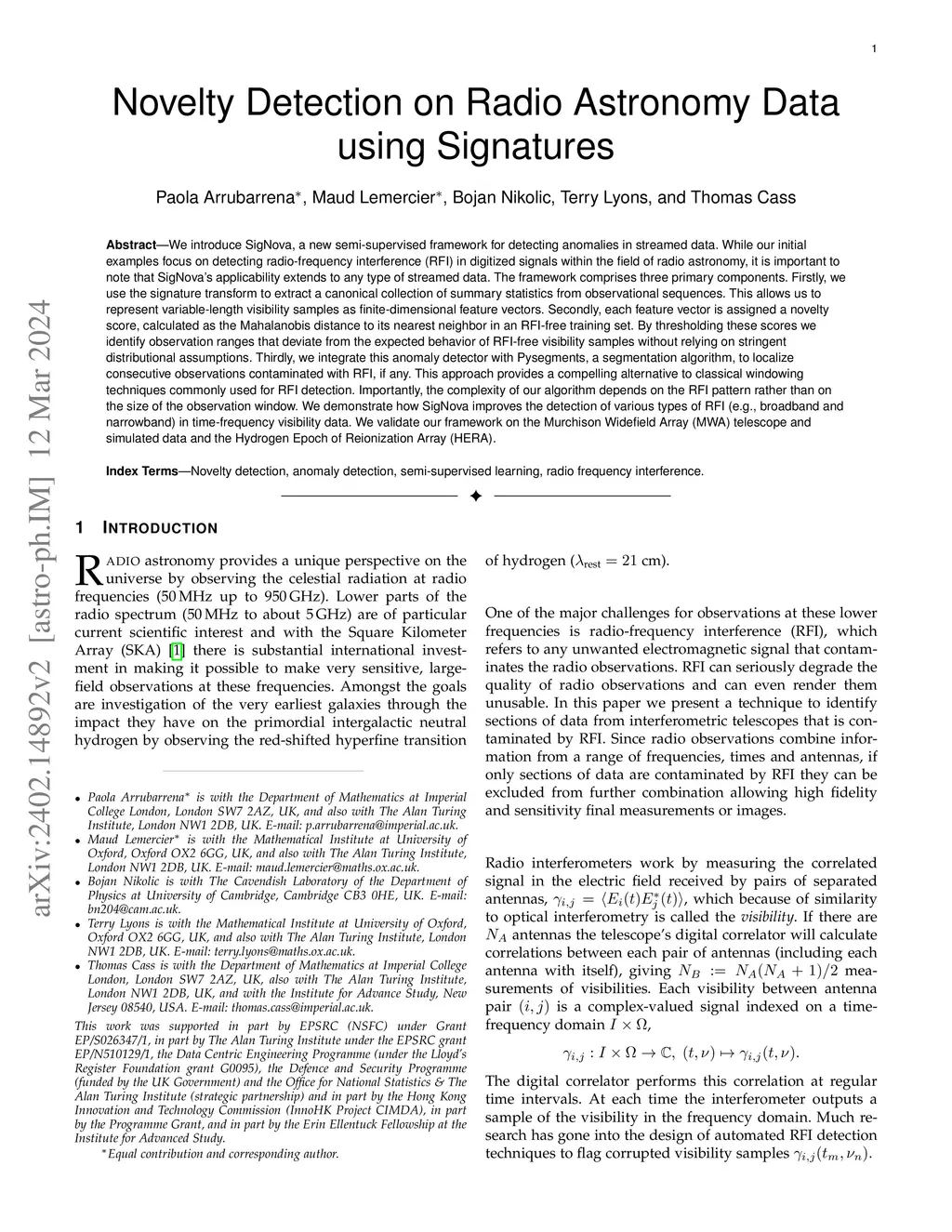 We introduce SigNova, a new semi-supervised framework for detecting anomalies in streamed data. While our initial examples focus on detecting radio-frequency interference (RFI) in digitized signals within the field of radio astronomy, it is important to note that SigNova's applicability extends to any type of streamed data. The framework comprises three primary components. Firstly, we use the signature transform to extract a canonical collection of summary statistics from observational sequences. This allows us to represent variable-length visibility samples as finite-dimensional feature vectors. Secondly, each feature vector is assigned a novelty score, calculated as the Mahalanobis distance to its nearest neighbor in an RFI-free training set. By thresholding these scores we identify observation ranges that deviate from the expected behavior of RFI-free visibility samples without relying on stringent distributional assumptions. Thirdly, we integrate this anomaly detector with Pysegments, a segmentation algorithm, to localize consecutive observations contaminated with RFI, if any. This approach provides a compelling alternative to classical windowing techniques commonly used for RFI detection. Importantly, the complexity of our algorithm depends on the RFI pattern rather than on the size of the observation window. We demonstrate how SigNova improves the detection of various types of RFI (e.g., broadband and narrowband) in time-frequency visibility data. We validate our framework on the Murchison Widefield Array (MWA) telescope and simulated data and the Hydrogen Epoch of Reionization Array (HERA).