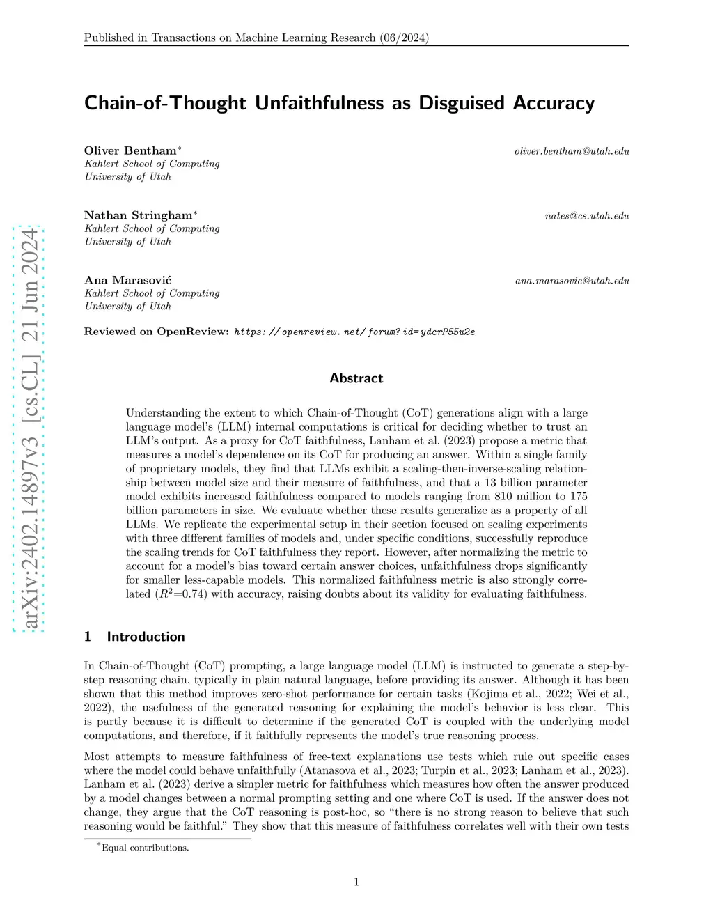 Understanding the extent to which Chain-of-Thought (CoT) generations align with a large language model's (LLM) internal computations is critical for deciding whether to trust an LLM's output. As a proxy for CoT faithfulness, Lanham et al. (2023) propose a metric that measures a model's dependence on its CoT for producing an answer. Within a single family of proprietary models, they find that LLMs exhibit a scaling-then-inverse-scaling relationship between model size and their measure of faithfulness, and that a 13 billion parameter model exhibits increased faithfulness compared to models ranging from 810 million to 175 billion parameters in size. We evaluate whether these results generalize as a property of all LLMs. We replicate the experimental setup in their section focused on scaling experiments with three different families of models and, under specific conditions, successfully reproduce the scaling trends for CoT faithfulness they report. However, after normalizing the metric to account for a model's bias toward certain answer choices, unfaithfulness drops significantly for smaller less-capable models. This normalized faithfulness metric is also strongly correlated (=0.74) with accuracy, raising doubts about its validity for evaluating faithfulness.