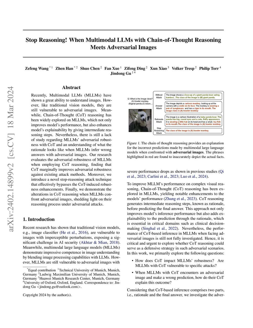 Recently, Multimodal LLMs (MLLMs) have shown a great ability to understand images. However, like traditional vision models, they are still vulnerable to adversarial images. Meanwhile, Chain-of-Thought (CoT) reasoning has been widely explored on MLLMs, which not only improves model's performance, but also enhances model's explainability by giving intermediate reasoning steps. Nevertheless, there is still a lack of study regarding MLLMs' adversarial robustness with CoT and an understanding of what the rationale looks like when MLLMs infer wrong answers with adversarial images. Our research evaluates the adversarial robustness of MLLMs when employing CoT reasoning, finding that CoT marginally improves adversarial robustness against existing attack methods. Moreover, we introduce a novel stop-reasoning attack technique that effectively bypasses the CoT-induced robustness enhancements. Finally, we demonstrate the alterations in CoT reasoning when MLLMs confront adversarial images, shedding light on their reasoning process under adversarial attacks.