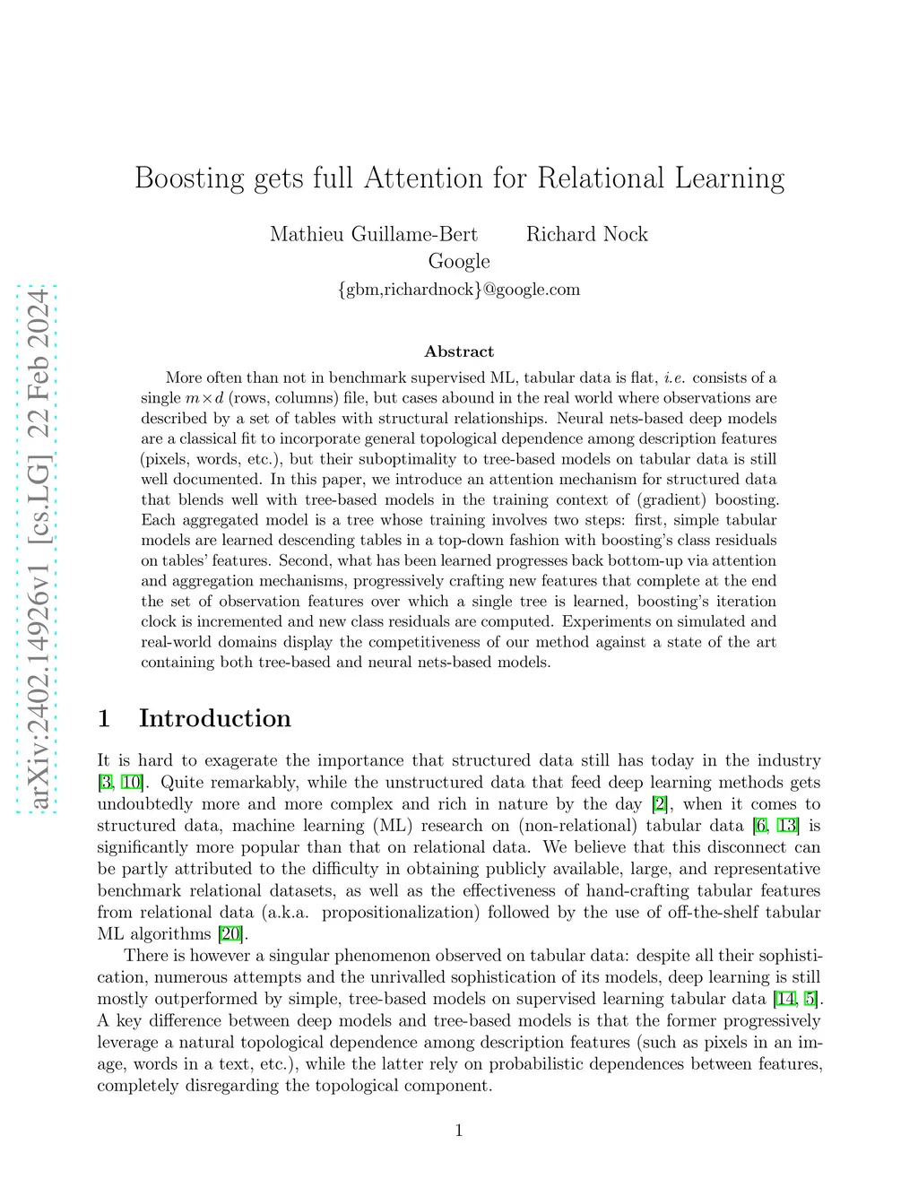 More often than not in benchmark supervised ML, tabular data is flat, i.e. consists of a single (rows, columns) file, but cases abound in the real world where observations are described by a set of tables with structural relationships. Neural nets-based deep models are a classical fit to incorporate general topological dependence among description features (pixels, words, etc.), but their suboptimality to tree-based models on tabular data is still well documented. In this paper, we introduce an attention mechanism for structured data that blends well with tree-based models in the training context of (gradient) boosting. Each aggregated model is a tree whose training involves two steps: first, simple tabular models are learned descending tables in a top-down fashion with boosting's class residuals on tables' features. Second, what has been learned progresses back bottom-up via attention and aggregation mechanisms, progressively crafting new features that complete at the end the set of observation features over which a single tree is learned, boosting's iteration clock is incremented and new class residuals are computed. Experiments on simulated and real-world domains display the competitiveness of our method against a state of the art containing both tree-based and neural nets-based models.