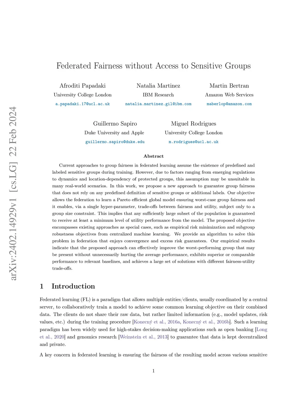 Current approaches to group fairness in federated learning assume the existence of predefined and labeled sensitive groups during training. However, due to factors ranging from emerging regulations to dynamics and location-dependency of protected groups, this assumption may be unsuitable in many real-world scenarios. In this work, we propose a new approach to guarantee group fairness that does not rely on any predefined definition of sensitive groups or additional labels. Our objective allows the federation to learn a Pareto efficient global model ensuring worst-case group fairness and it enables, via a single hyper-parameter, trade-offs between fairness and utility, subject only to a group size constraint. This implies that any sufficiently large subset of the population is guaranteed to receive at least a minimum level of utility performance from the model. The proposed objective encompasses existing approaches as special cases, such as empirical risk minimization and subgroup robustness objectives from centralized machine learning. We provide an algorithm to solve this problem in federation that enjoys convergence and excess risk guarantees. Our empirical results indicate that the proposed approach can effectively improve the worst-performing group that may be present without unnecessarily hurting the average performance, exhibits superior or comparable performance to relevant baselines, and achieves a large set of solutions with different fairness-utility trade-offs.