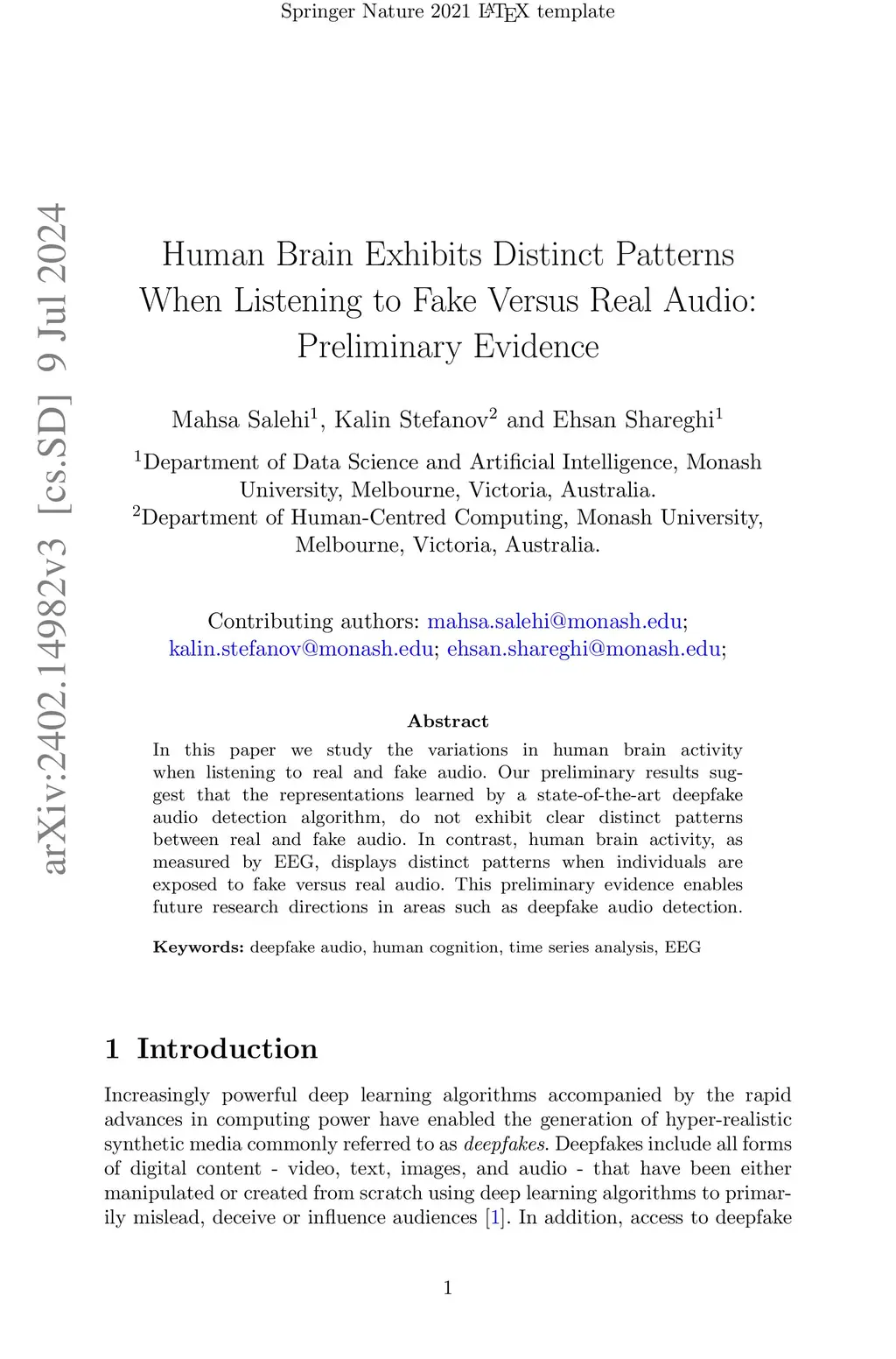 Human Brain Exhibits Distinct Patterns When Listening to Fake Versus