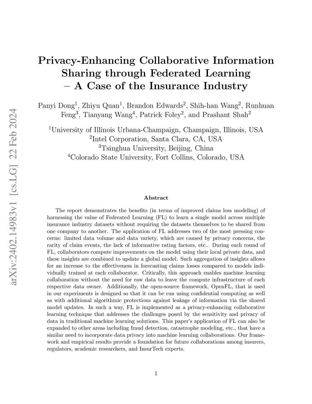 The report demonstrates the benefits (in terms of improved claims loss modeling) of harnessing the value of Federated Learning (FL) to learn a single model across multiple insurance industry datasets without requiring the datasets themselves to be shared from one company to another. The application of FL addresses two of the most pressing concerns: limited data volume and data variety, which are caused by privacy concerns, the rarity of claim events, the lack of informative rating factors, etc.. During each round of FL, collaborators compute improvements on the model using their local private data, and these insights are combined to update a global model. Such aggregation of insights allows for an increase to the effectiveness in forecasting claims losses compared to models individually trained at each collaborator. Critically, this approach enables machine learning collaboration without the need for raw data to leave the compute infrastructure of each respective data owner. Additionally, the open-source framework, OpenFL, that is used in our experiments is designed so that it can be run using confidential computing as well as with additional algorithmic protections against leakage of information via the shared model updates. In such a way, FL is implemented as a privacy-enhancing collaborative learning technique that addresses the challenges posed by the sensitivity and privacy of data in traditional machine learning solutions. This paper's application of FL can also be expanded to other areas including fraud detection, catastrophe modeling, etc., that have a similar need to incorporate data privacy into machine learning collaborations. Our framework and empirical results provide a foundation for future collaborations among insurers, regulators, academic researchers, and InsurTech experts.