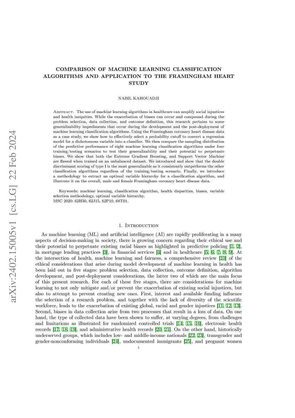 The use of machine learning algorithms in healthcare can amplify social injustices and health inequities. While the exacerbation of biases can occur and compound during the problem selection, data collection, and outcome definition, this research pertains to some generalizability impediments that occur during the development and the post-deployment of machine learning classification algorithms. Using the Framingham coronary heart disease data as a case study, we show how to effectively select a probability cutoff to convert a regression model for a dichotomous variable into a classifier. We then compare the sampling distribution of the predictive performance of eight machine learning classification algorithms under four training/testing scenarios to test their generalizability and their potential to perpetuate biases. We show that both the Extreme Gradient Boosting, and Support Vector Machine are flawed when trained on an unbalanced dataset. We introduced and show that the double discriminant scoring of type I is the most generalizable as it consistently outperforms the other classification algorithms regardless of the training/testing scenario. Finally, we introduce a methodology to extract an optimal variable hierarchy for a classification algorithm, and illustrate it on the overall, male and female Framingham coronary heart disease data.