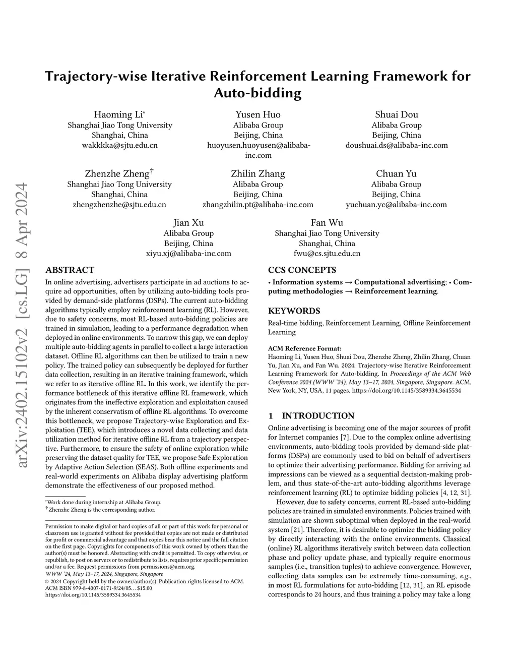 In online advertising, advertisers participate in ad auctions to acquire ad opportunities, often by utilizing auto-bidding tools provided by demand-side platforms (DSPs). The current auto-bidding algorithms typically employ reinforcement learning (RL). However, due to safety concerns, most RL-based auto-bidding policies are trained in simulation, leading to a performance degradation when deployed in online environments. To narrow this gap, we can deploy multiple auto-bidding agents in parallel to collect a large interaction dataset. Offline RL algorithms can then be utilized to train a new policy. The trained policy can subsequently be deployed for further data collection, resulting in an iterative training framework, which we refer to as iterative offline RL. In this work, we identify the performance bottleneck of this iterative offline RL framework, which originates from the ineffective exploration and exploitation caused by the inherent conservatism of offline RL algorithms. To overcome this bottleneck, we propose Trajectory-wise Exploration and Exploitation (TEE), which introduces a novel data collecting and data utilization method for iterative offline RL from a trajectory perspective. Furthermore, to ensure the safety of online exploration while preserving the dataset quality for TEE, we propose Safe Exploration by Adaptive Action Selection (SEAS). Both offline experiments and real-world experiments on Alibaba display advertising platform demonstrate the effectiveness of our proposed method.