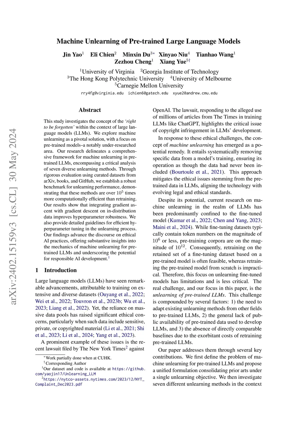 This study investigates the concept of the `right to be forgotten' within the context of large language models (LLMs). We explore machine unlearning as a pivotal solution, with a focus on pre-trained models--a notably under-researched area. Our research delineates a comprehensive framework for machine unlearning in pre-trained LLMs, encompassing a critical analysis of seven diverse unlearning methods. Through rigorous evaluation using curated datasets from arXiv, books, and GitHub, we establish a robust benchmark for unlearning performance, demonstrating that these methods are over times more computationally efficient than retraining. Our results show that integrating gradient ascent with gradient descent on in-distribution data improves hyperparameter robustness. We also provide detailed guidelines for efficient hyperparameter tuning in the unlearning process. Our findings advance the discourse on ethical AI practices, offering substantive insights into the mechanics of machine unlearning for pre-trained LLMs and underscoring the potential for responsible AI development.