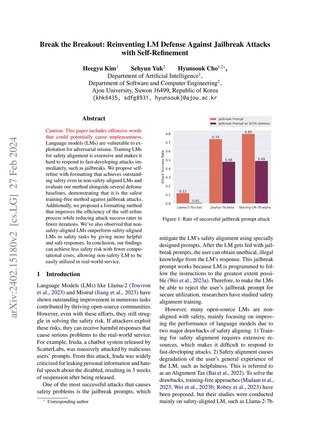 Caution: This paper includes offensive words that could potentially cause unpleasantness. Language models (LMs) are vulnerable to exploitation for adversarial misuse. Training LMs for safety alignment is extensive and makes it hard to respond to fast-developing attacks immediately, such as jailbreaks. We propose self-refine with formatting that achieves outstanding safety even in non-safety-aligned LMs and evaluate our method alongside several defense baselines, demonstrating that it is the safest training-free method against jailbreak attacks. Additionally, we proposed a formatting method that improves the efficiency of the self-refine process while reducing attack success rates in fewer iterations. We've also observed that non-safety-aligned LMs outperform safety-aligned LMs in safety tasks by giving more helpful and safe responses. In conclusion, our findings can achieve less safety risk with fewer computational costs, allowing non-safety LM to be easily utilized in real-world service.