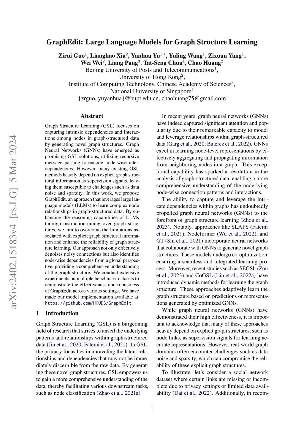 Graph Structure Learning (GSL) focuses on capturing intrinsic dependencies and interactions among nodes in graph-structured data by generating novel graph structures. Graph Neural Networks (GNNs) have emerged as promising GSL solutions, utilizing recursive message passing to encode node-wise inter-dependencies. However, many existing GSL methods heavily depend on explicit graph structural information as supervision signals, leaving them susceptible to challenges such as data noise and sparsity. In this work, we propose GraphEdit, an approach that leverages large language models (LLMs) to learn complex node relationships in graph-structured data. By enhancing the reasoning capabilities of LLMs through instruction-tuning over graph structures, we aim to overcome the limitations associated with explicit graph structural information and enhance the reliability of graph structure learning. Our approach not only effectively denoises noisy connections but also identifies node-wise dependencies from a global perspective, providing a comprehensive understanding of the graph structure. We conduct extensive experiments on multiple benchmark datasets to demonstrate the effectiveness and robustness of GraphEdit across various settings. We have made our model implementation available at:this https URL.