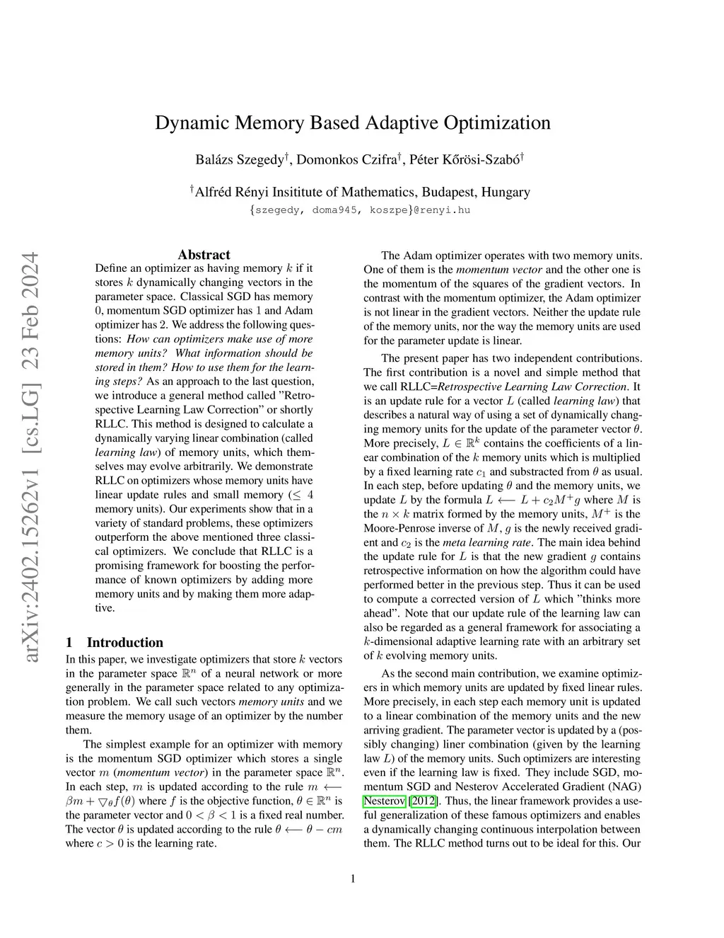 Define an optimizer as having memory if it stores dynamically changing vectors in the parameter space. Classical SGD has memory , momentum SGD optimizer has and Adam optimizer has . We address the following questions: How can optimizers make use of more memory units? What information should be stored in them? How to use them for the learning steps? As an approach to the last question, we introduce a general method called "Retrospective Learning Law Correction" or shortly RLLC. This method is designed to calculate a dynamically varying linear combination (called learning law) of memory units, which themselves may evolve arbitrarily. We demonstrate RLLC on optimizers whose memory units have linear update rules and small memory ( memory units). Our experiments show that in a variety of standard problems, these optimizers outperform the above mentioned three classical optimizers. We conclude that RLLC is a promising framework for boosting the performance of known optimizers by adding more memory units and by making them more adaptive.