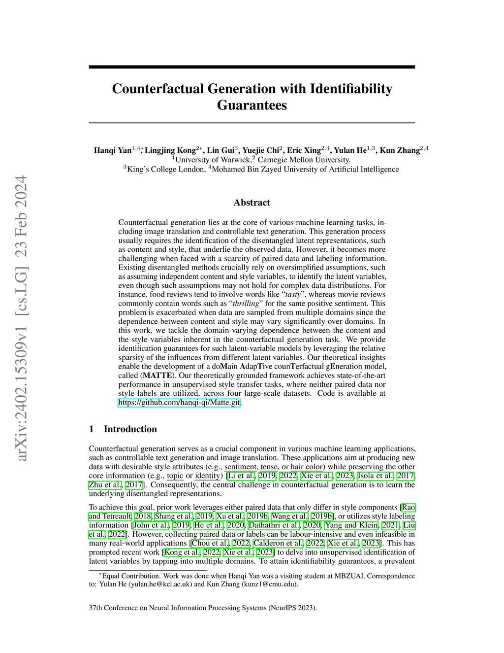 Counterfactual generation lies at the core of various machine learning tasks, including image translation and controllable text generation. This generation process usually requires the identification of the disentangled latent representations, such as content and style, that underlie the observed data. However, it becomes more challenging when faced with a scarcity of paired data and labeling information. Existing disentangled methods crucially rely on oversimplified assumptions, such as assuming independent content and style variables, to identify the latent variables, even though such assumptions may not hold for complex data distributions. For instance, food reviews tend to involve words like tasty, whereas movie reviews commonly contain words such as thrilling for the same positive sentiment. This problem is exacerbated when data are sampled from multiple domains since the dependence between content and style may vary significantly over domains. In this work, we tackle the domain-varying dependence between the content and the style variables inherent in the counterfactual generation task. We provide identification guarantees for such latent-variable models by leveraging the relative sparsity of the influences from different latent variables. Our theoretical insights enable the development of a doMain AdapTive counTerfactual gEneration model, called (MATTE). Our theoretically grounded framework achieves state-of-the-art performance in unsupervised style transfer tasks, where neither paired data nor style labels are utilized, across four large-scale datasets. Code is available at https://github.com/hanqi-qi/Matte.git
