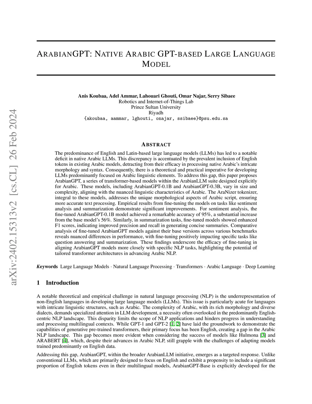 The predominance of English and Latin-based large language models (LLMs) has led to a notable deficit in native Arabic LLMs. This discrepancy is accentuated by the prevalent inclusion of English tokens in existing Arabic models, detracting from their efficacy in processing native Arabic's intricate morphology and syntax. Consequently, there is a theoretical and practical imperative for developing LLMs predominantly focused on Arabic linguistic elements. To address this gap, this paper proposes ArabianGPT, a series of transformer-based models within the ArabianLLM suite designed explicitly for Arabic. These models, including ArabianGPT-0.1B and ArabianGPT-0.3B, vary in size and complexity, aligning with the nuanced linguistic characteristics of Arabic. The AraNizer tokenizer, integral to these models, addresses the unique morphological aspects of Arabic script, ensuring more accurate text processing. Empirical results from fine-tuning the models on tasks like sentiment analysis and summarization demonstrate significant improvements. For sentiment analysis, the fine-tuned ArabianGPT-0.1B model achieved a remarkable accuracy of 95%, a substantial increase from the base model's 56%. Similarly, in summarization tasks, fine-tuned models showed enhanced F1 scores, indicating improved precision and recall in generating concise summaries. Comparative analysis of fine-tuned ArabianGPT models against their base versions across various benchmarks reveals nuanced differences in performance, with fine-tuning positively impacting specific tasks like question answering and summarization. These findings underscore the efficacy of fine-tuning in aligning ArabianGPT models more closely with specific NLP tasks, highlighting the potential of tailored transformer architectures in advancing Arabic NLP.
