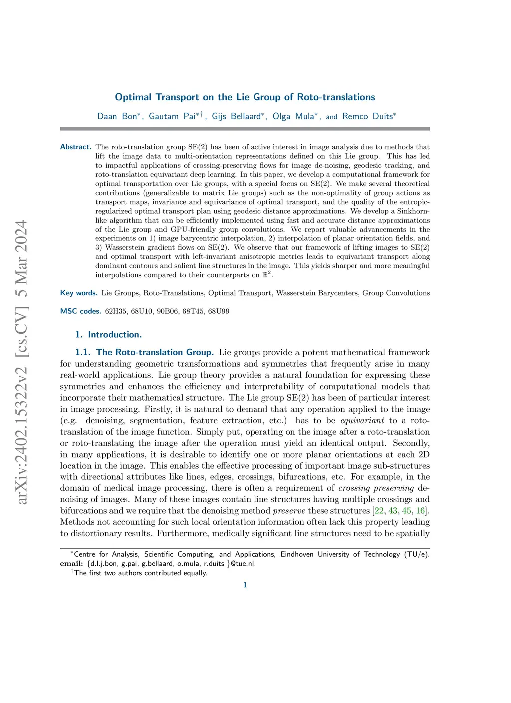 The roto-translation group SE2 has been of active interest in image analysis due to methods that lift the image data to multi-orientation representations defined on this Lie group. This has led to impactful applications of crossing-preserving flows for image de-noising, geodesic tracking, and roto-translation equivariant deep learning. In this paper, we develop a computational framework for optimal transportation over Lie groups, with a special focus on SE2. We make several theoretical contributions (generalizable to matrix Lie groups) such as the non-optimality of group actions as transport maps, invariance and equivariance of optimal transport, and the quality of the entropic-regularized optimal transport plan using geodesic distance approximations. We develop a Sinkhorn like algorithm that can be efficiently implemented using fast and accurate distance approximations of the Lie group and GPU-friendly group convolutions. We report valuable advancements in the experiments on 1) image barycentric interpolation, 2) interpolation of planar orientation fields, and 3) Wasserstein gradient flows on SE2. We observe that our framework of lifting images to SE2 and optimal transport with left-invariant anisotropic metrics leads to equivariant transport along dominant contours and salient line structures in the image. This yields sharper and more meaningful interpolations compared to their counterparts on R^2