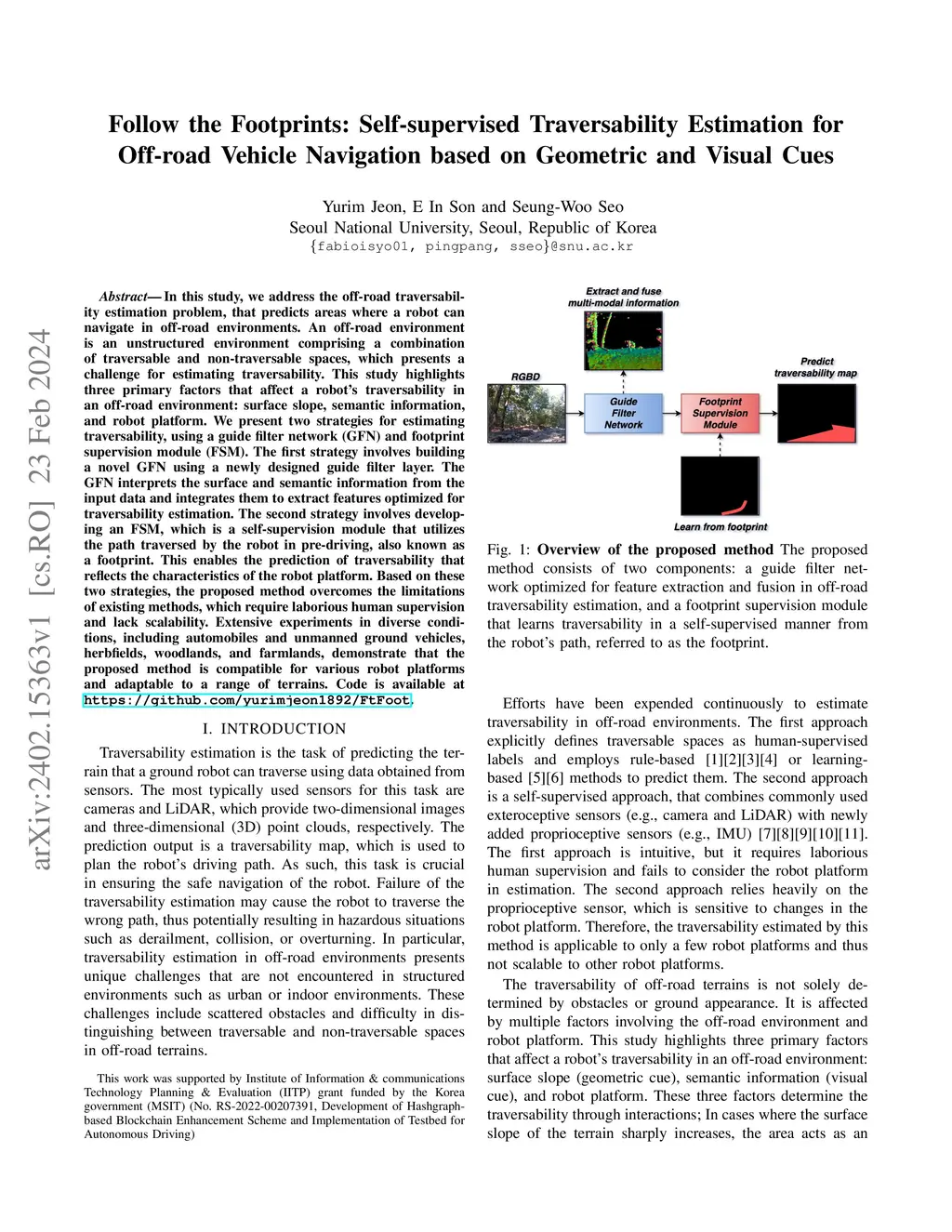 In this study, we address the off-road traversability estimation problem, that predicts areas where a robot can navigate in off-road environments. An off-road environment is an unstructured environment comprising a combination of traversable and non-traversable spaces, which presents a challenge for estimating traversability. This study highlights three primary factors that affect a robot's traversability in an off-road environment: surface slope, semantic information, and robot platform. We present two strategies for estimating traversability, using a guide filter network (GFN) and footprint supervision module (FSM). The first strategy involves building a novel GFN using a newly designed guide filter layer. The GFN interprets the surface and semantic information from the input data and integrates them to extract features optimized for traversability estimation. The second strategy involves developing an FSM, which is a self-supervision module that utilizes the path traversed by the robot in pre-driving, also known as a footprint. This enables the prediction of traversability that reflects the characteristics of the robot platform. Based on these two strategies, the proposed method overcomes the limitations of existing methods, which require laborious human supervision and lack scalability. Extensive experiments in diverse conditions, including automobiles and unmanned ground vehicles, herbfields, woodlands, and farmlands, demonstrate that the proposed method is compatible for various robot platforms and adaptable to a range of terrains. Code is available at https://github.com/yurimjeon1892/FtFoot.