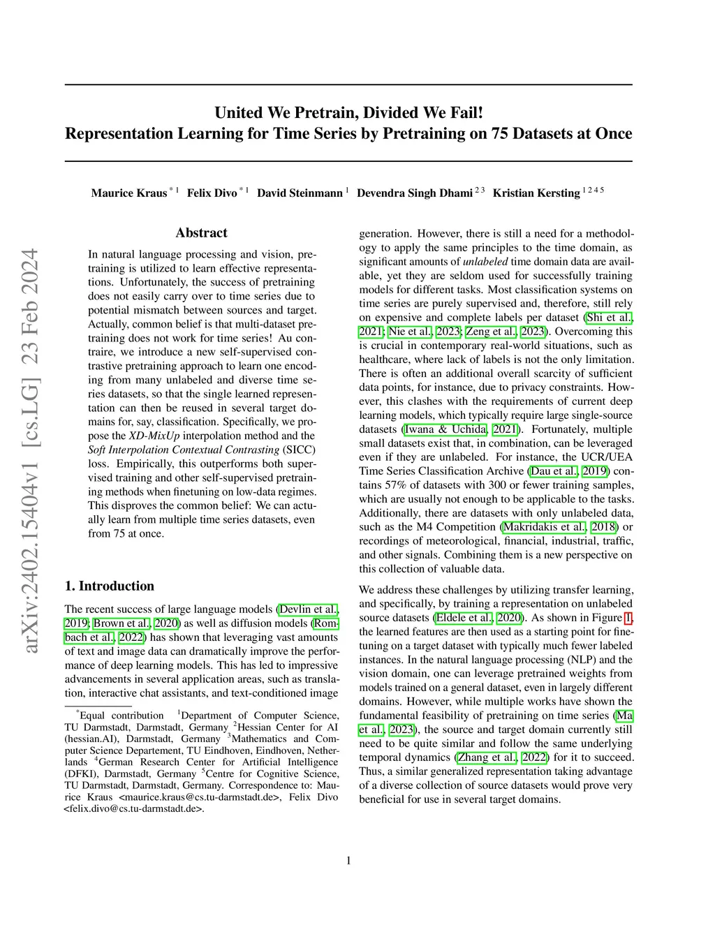In natural language processing and vision, pretraining is utilized to learn effective representations. Unfortunately, the success of pretraining does not easily carry over to time series due to potential mismatch between sources and target. Actually, common belief is that multi-dataset pretraining does not work for time series! Au contraire, we introduce a new self-supervised contrastive pretraining approach to learn one encoding from many unlabeled and diverse time series datasets, so that the single learned representation can then be reused in several target domains for, say, classification. Specifically, we propose the XD-MixUp interpolation method and the Soft Interpolation Contextual Contrasting (SICC) loss. Empirically, this outperforms both supervised training and other self-supervised pretraining methods when finetuning on low-data regimes. This disproves the common belief: We can actually learn from multiple time series datasets, even from 75 at once.
