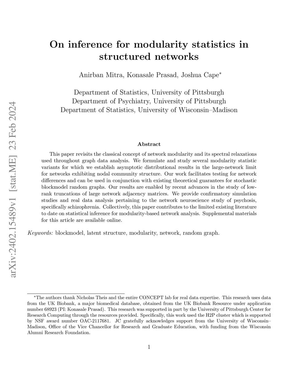 This paper revisits the classical concept of network modularity and its spectral relaxations used throughout graph data analysis. We formulate and study several modularity statistic variants for which we establish asymptotic distributional results in the large-network limit for networks exhibiting nodal community structure. Our work facilitates testing for network differences and can be used in conjunction with existing theoretical guarantees for stochastic blockmodel random graphs. Our results are enabled by recent advances in the study of low-rank truncations of large network adjacency matrices. We provide confirmatory simulation studies and real data analysis pertaining to the network neuroscience study of psychosis, specifically schizophrenia. Collectively, this paper contributes to the limited existing literature to date on statistical inference for modularity-based network analysis. Supplemental materials for this article are available online.