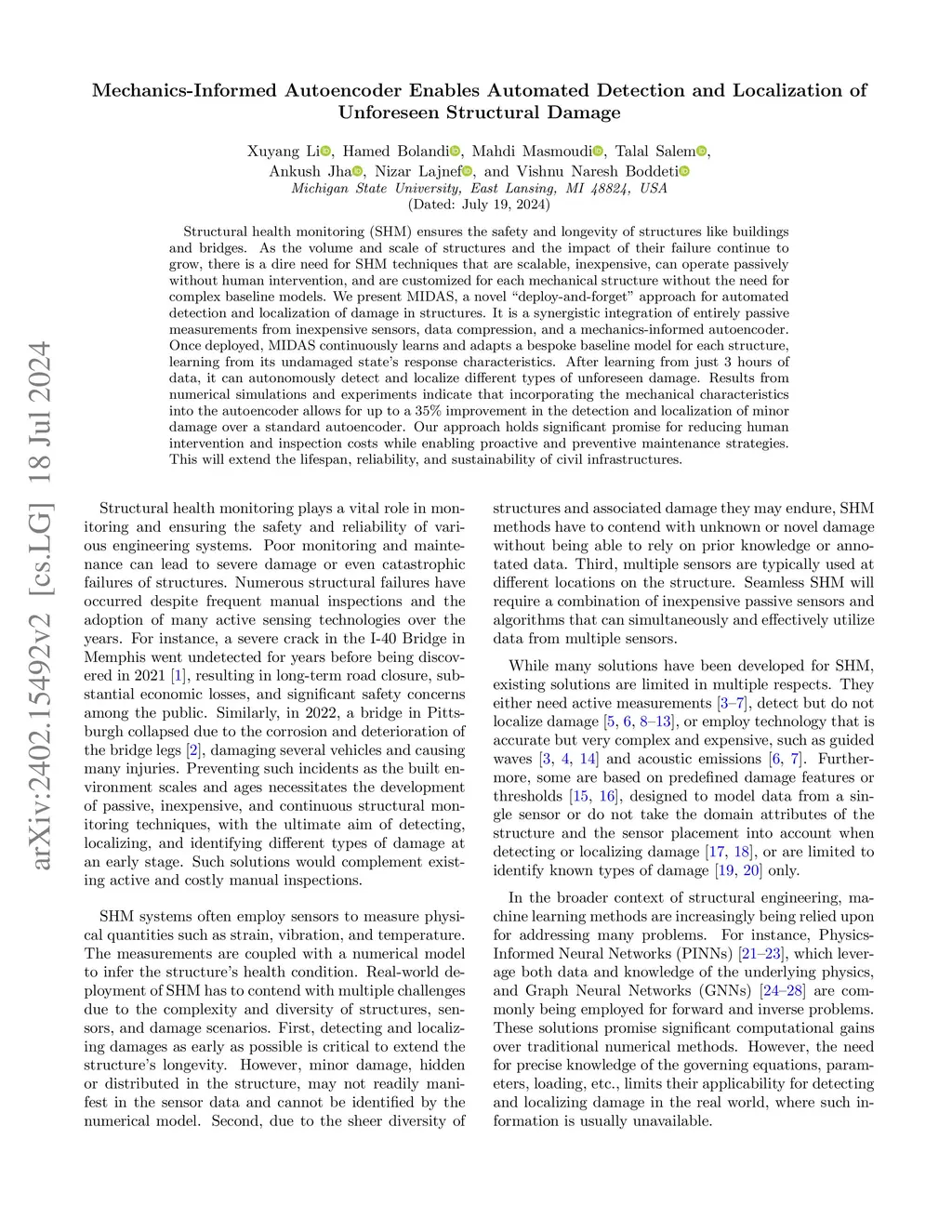 Structural health monitoring (SHM) is vital for ensuring the safety and longevity of structures like buildings and bridges. As the volume and scale of structures and the impact of their failure continue to grow, there is a dire need for SHM techniques that are scalable, inexpensive, operate passively without human intervention, and customized for each mechanical structure without the need for complex baseline models. We present a novel "deploy-and-forget" approach for automated detection and localization of damages in structures. It is based on a synergistic combination of fully passive measurements from inexpensive sensors and a mechanics-informed autoencoder. Once deployed, our solution continuously learns and adapts a bespoke baseline model for each structure, learning from its undamaged state's response characteristics. After learning from just 3 hours of data, it can autonomously detect and localize different types of unforeseen damage. Results from numerical simulations and experiments indicate that incorporating the mechanical characteristics into the variational autoencoder allows for up to 35\% earlier detection and localization of damage over a standard autoencoder. Our approach holds substantial promise for a significant reduction in human intervention and inspection costs and enables proactive and preventive maintenance strategies, thus extending the lifespan, reliability, and sustainability of civil infrastructures.