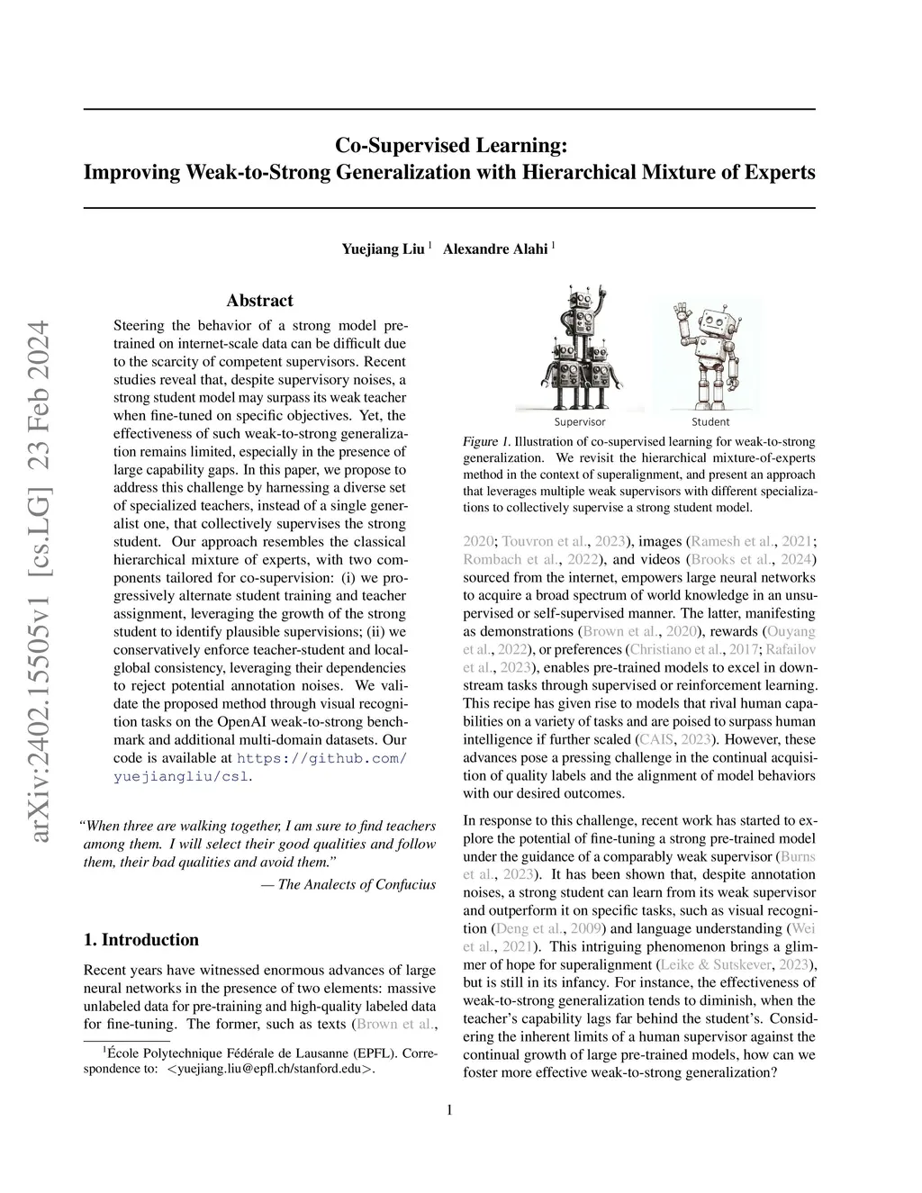 Steering the behavior of a strong model pre-trained on internet-scale data can be difficult due to the scarcity of competent supervisors. Recent studies reveal that, despite supervisory noises, a strong student model may surpass its weak teacher when fine-tuned on specific objectives. Yet, the effectiveness of such weak-to-strong generalization remains limited, especially in the presence of large capability gaps. In this paper, we propose to address this challenge by harnessing a diverse set of specialized teachers, instead of a single generalist one, that collectively supervises the strong student. Our approach resembles the classical hierarchical mixture of experts, with two components tailored for co-supervision: (i) we progressively alternate student training and teacher assignment, leveraging the growth of the strong student to identify plausible supervisions; (ii) we conservatively enforce teacher-student and local-global consistency, leveraging their dependencies to reject potential annotation noises. We validate the proposed method through visual recognition tasks on the OpenAI weak-to-strong benchmark and additional multi-domain datasets. Our code is available at \url{https://github.com/yuejiangliu/csl}.