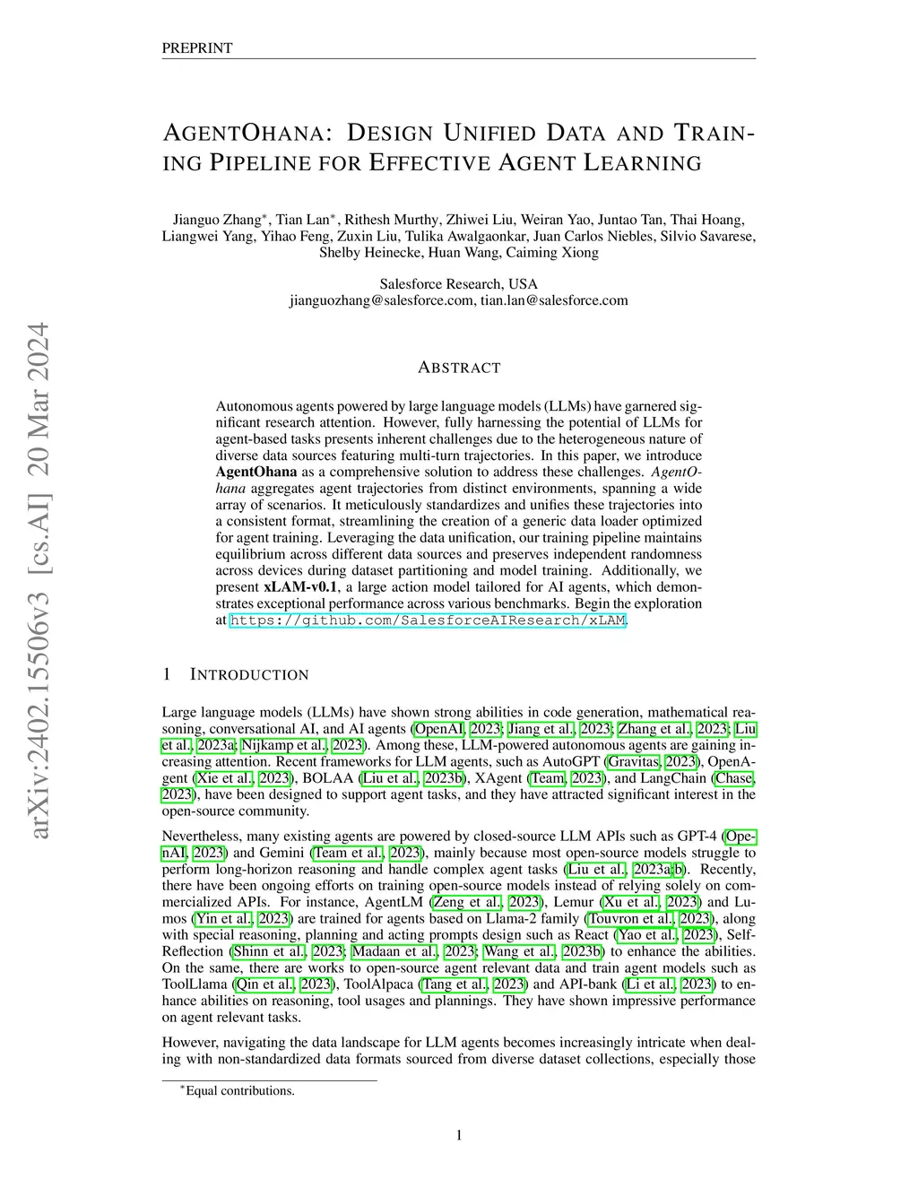 Autonomous agents powered by large language models (LLMs) have garnered significant research attention. However, fully harnessing the potential of LLMs for agent-based tasks presents inherent challenges due to the heterogeneous nature of diverse data sources featuring multi-turn trajectories. In this paper, we introduce \textbf{AgentOhana} as a comprehensive solution to address these challenges. \textit{AgentOhana} aggregates agent trajectories from distinct environments, spanning a wide array of scenarios. It meticulously standardizes and unifies these trajectories into a consistent format, streamlining the creation of a generic data loader optimized for agent training. Leveraging the data unification, our training pipeline maintains equilibrium across different data sources and preserves independent randomness across devices during dataset partitioning and model training. Additionally, we present \textbf{xLAM-v0.1}, a large action model tailored for AI agents, which demonstrates exceptional performance across various benchmarks. Begin the exploration at \url{https://github.com/SalesforceAIResearch/xLAM}.