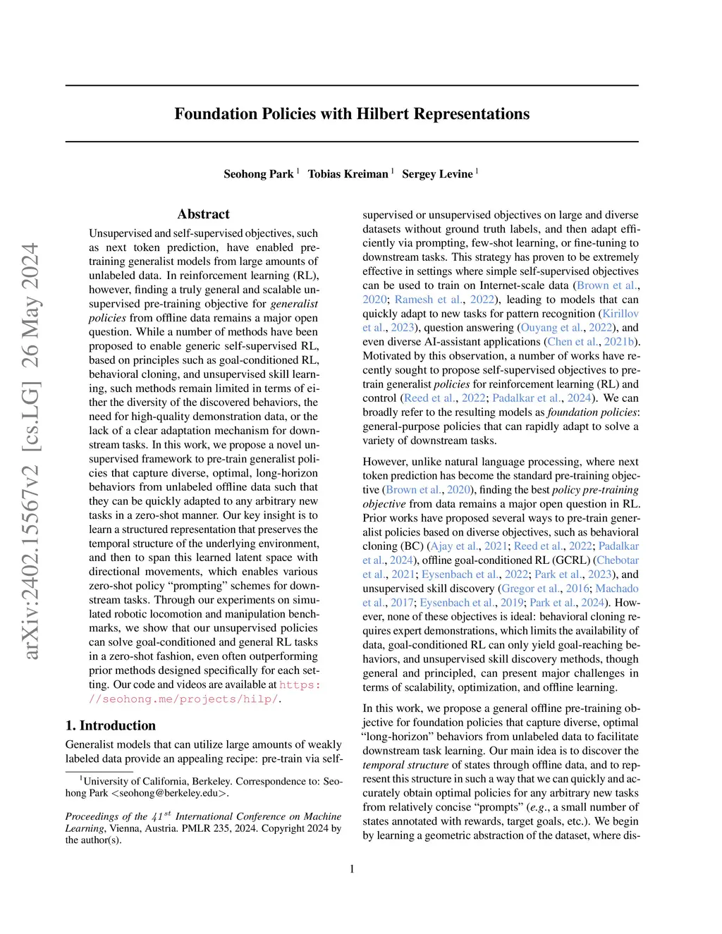 Unsupervised and self-supervised objectives, such as next token prediction, have enabled pre-training generalist models from large amounts of unlabeled data. In reinforcement learning (RL), however, finding a truly general and scalable unsupervised pre-training objective for generalist policies from offline data remains a major open question. While a number of methods have been proposed to enable generic self-supervised RL, based on principles such as goal-conditioned RL, behavioral cloning, and unsupervised skill learning, such methods remain limited in terms of either the diversity of the discovered behaviors, the need for high-quality demonstration data, or the lack of a clear adaptation mechanism for downstream tasks. In this work, we propose a novel unsupervised framework to pre-train generalist policies that capture diverse, optimal, long-horizon behaviors from unlabeled offline data such that they can be quickly adapted to any arbitrary new tasks in a zero-shot manner. Our key insight is to learn a structured representation that preserves the temporal structure of the underlying environment, and then to span this learned latent space with directional movements, which enables various zero-shot policy "prompting" schemes for downstream tasks. Through our experiments on simulated robotic locomotion and manipulation benchmarks, we show that our unsupervised policies can solve goal-conditioned and general RL tasks in a zero-shot fashion, even often outperforming prior methods designed specifically for each setting. Our code and videos are available at https://seohong.me/projects/hilp/.