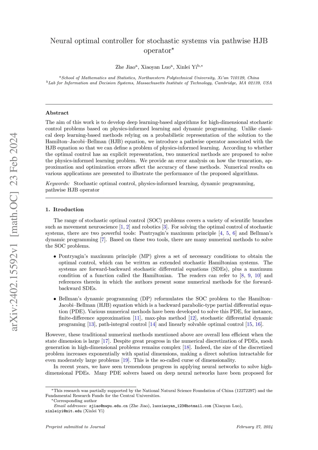 Solving a class of stochastic optimal control problems by physics-informed neural networks