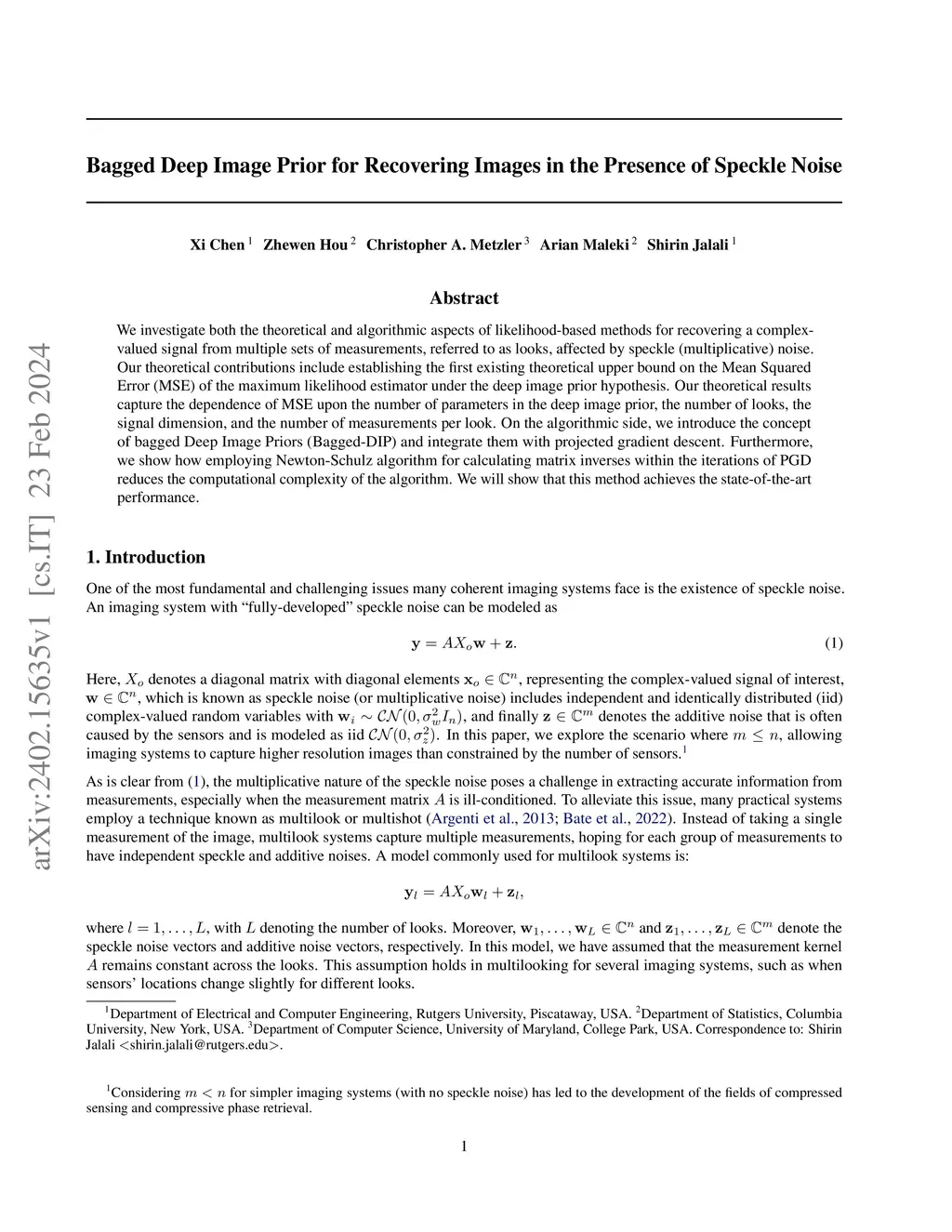 We investigate both the theoretical and algorithmic aspects of likelihood-based methods for recovering a complex-valued signal from multiple sets of measurements, referred to as looks, affected by speckle (multiplicative) noise. Our theoretical contributions include establishing the first existing theoretical upper bound on the Mean Squared Error (MSE) of the maximum likelihood estimator under the deep image prior hypothesis. Our theoretical results capture the dependence of MSE upon the number of parameters in the deep image prior, the number of looks, the signal dimension, and the number of measurements per look. On the algorithmic side, we introduce the concept of bagged Deep Image Priors (Bagged-DIP) and integrate them with projected gradient descent. Furthermore, we show how employing Newton-Schulz algorithm for calculating matrix inverses within the iterations of PGD reduces the computational complexity of the algorithm. We will show that this method achieves the state-of-the-art performance.