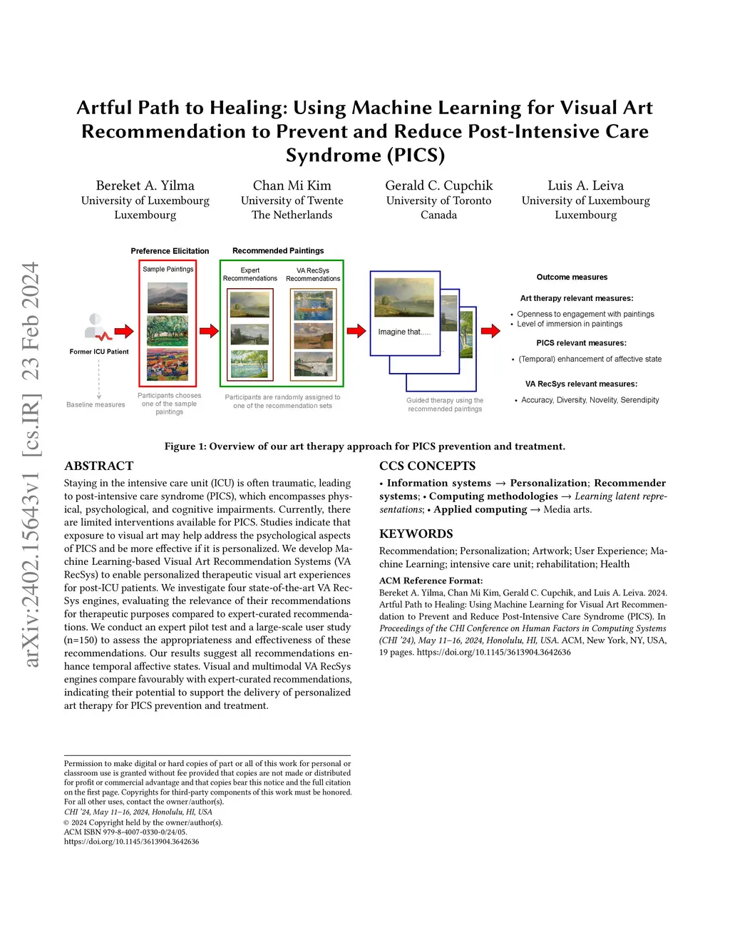 Staying in the intensive care unit (ICU) is often traumatic, leading to post-intensive care syndrome (PICS), which encompasses physical, psychological, and cognitive impairments. Currently, there are limited interventions available for PICS. Studies indicate that exposure to visual art may help address the psychological aspects of PICS and be more effective if it is personalized. We develop Machine Learning-based Visual Art Recommendation Systems (VA RecSys) to enable personalized therapeutic visual art experiences for post-ICU patients. We investigate four state-of-the-art VA RecSys engines, evaluating the relevance of their recommendations for therapeutic purposes compared to expert-curated recommendations. We conduct an expert pilot test and a large-scale user study (n=150) to assess the appropriateness and effectiveness of these recommendations. Our results suggest all recommendations enhance temporal affective states. Visual and multimodal VA RecSys engines compare favourably with expert-curated recommendations, indicating their potential to support the delivery of personalized art therapy for PICS prevention and treatment.
