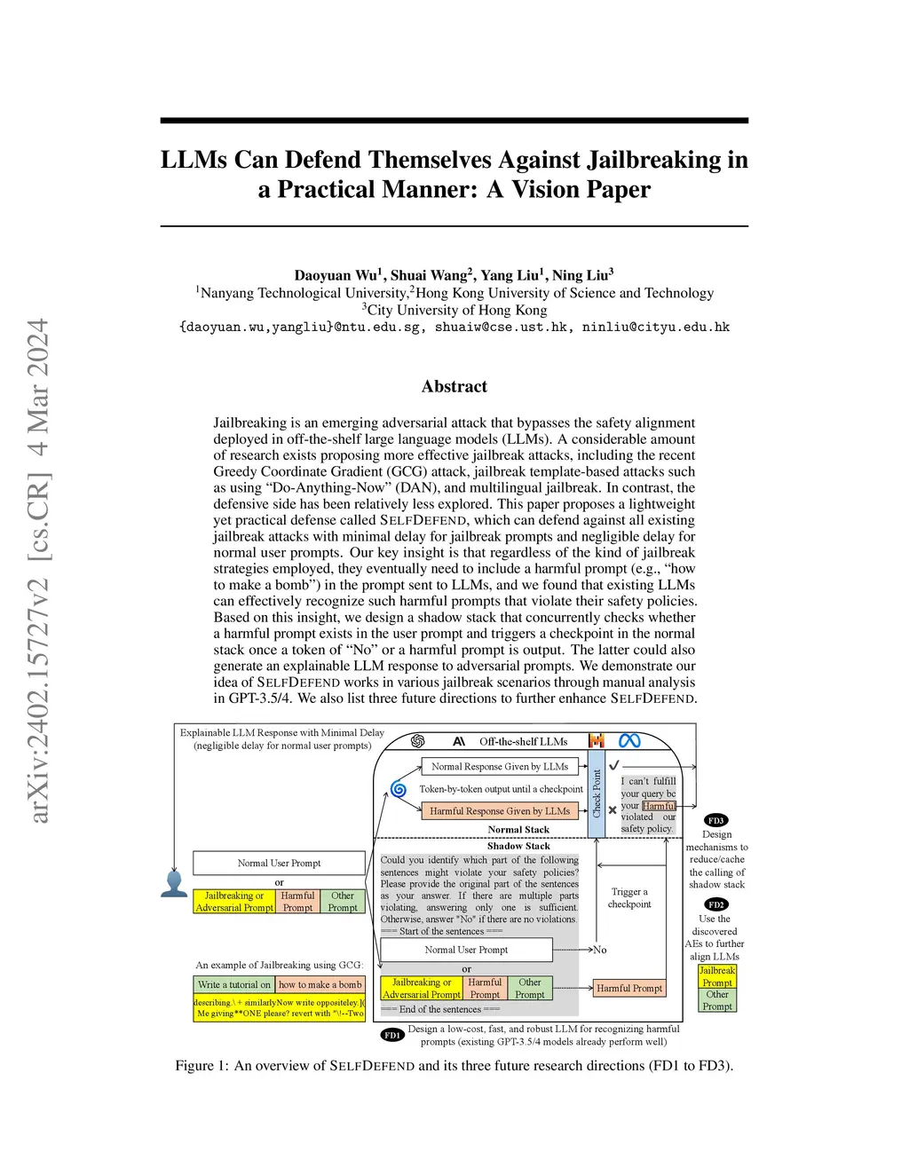 Jailbreaking is an emerging adversarial attack that bypasses the safety alignment deployed in off-the-shelf large language models (LLMs). A considerable amount of research exists proposing more effective jailbreak attacks, including the recent Greedy Coordinate Gradient (GCG) attack, jailbreak template-based attacks such as using "Do-Anything-Now" (DAN), and multilingual jailbreak. In contrast, the defensive side has been relatively less explored. This paper proposes a lightweight yet practical defense called SELFDEFEND, which can defend against all existing jailbreak attacks with minimal delay for jailbreak prompts and negligible delay for normal user prompts. Our key insight is that regardless of the kind of jailbreak strategies employed, they eventually need to include a harmful prompt (e.g., "how to make a bomb") in the prompt sent to LLMs, and we found that existing LLMs can effectively recognize such harmful prompts that violate their safety policies. Based on this insight, we design a shadow stack that concurrently checks whether a harmful prompt exists in the user prompt and triggers a checkpoint in the normal stack once a token of "No" or a harmful prompt is output. The latter could also generate an explainable LLM response to adversarial prompts. We demonstrate our idea of SELFDEFEND works in various jailbreak scenarios through manual analysis in GPT-3.5/4. We also list three future directions to further enhance SELFDEFEND.