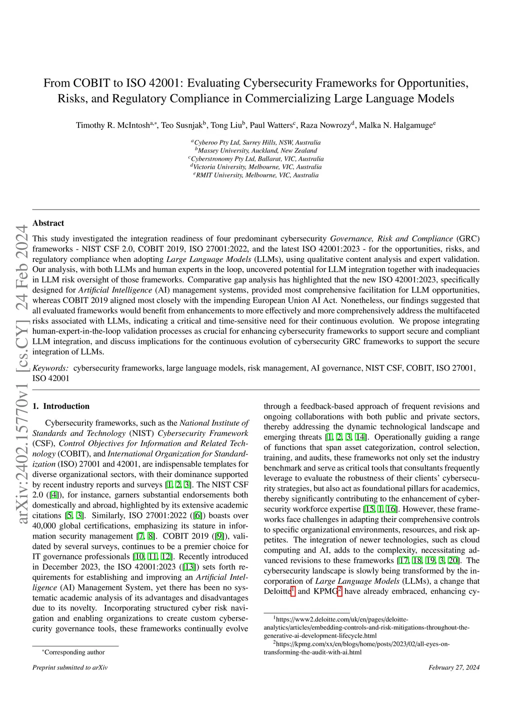 This study investigated the integration readiness of four predominant cybersecurity Governance, Risk and Compliance (GRC) frameworks - NIST CSF 2.0, COBIT 2019, ISO 27001:2022, and the latest ISO 42001:2023 - for the opportunities, risks, and regulatory compliance when adopting Large Language Models (LLMs), using qualitative content analysis and expert validation. Our analysis, with both LLMs and human experts in the loop, uncovered potential for LLM integration together with inadequacies in LLM risk oversight of those frameworks. Comparative gap analysis has highlighted that the new ISO 42001:2023, specifically designed for Artificial Intelligence (AI) management systems, provided most comprehensive facilitation for LLM opportunities, whereas COBIT 2019 aligned most closely with the impending European Union AI Act. Nonetheless, our findings suggested that all evaluated frameworks would benefit from enhancements to more effectively and more comprehensively address the multifaceted risks associated with LLMs, indicating a critical and time-sensitive need for their continuous evolution. We propose integrating human-expert-in-the-loop validation processes as crucial for enhancing cybersecurity frameworks to support secure and compliant LLM integration, and discuss implications for the continuous evolution of cybersecurity GRC frameworks to support the secure integration of LLMs.