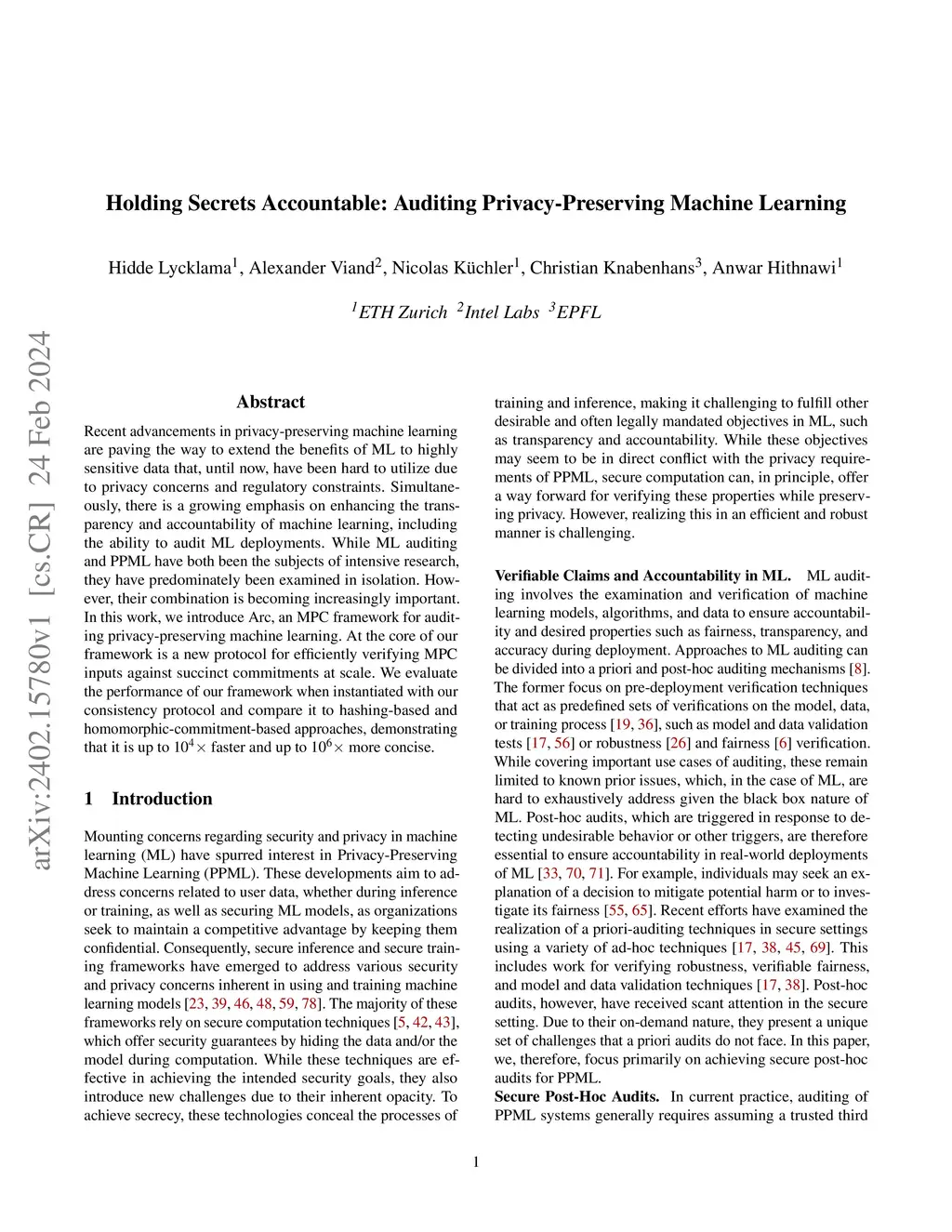 Recent advancements in privacy-preserving machine learning are paving the way to extend the benefits of ML to highly sensitive data that, until now, have been hard to utilize due to privacy concerns and regulatory constraints. Simultaneously, there is a growing emphasis on enhancing the transparency and accountability of machine learning, including the ability to audit ML deployments. While ML auditing and PPML have both been the subjects of intensive research, they have predominately been examined in isolation. However, their combination is becoming increasingly important. In this work, we introduce Arc, an MPC framework for auditing privacy-preserving machine learning. At the core of our framework is a new protocol for efficiently verifying MPC inputs against succinct commitments at scale. We evaluate the performance of our framework when instantiated with our consistency protocol and compare it to hashing-based and homomorphic-commitment-based approaches, demonstrating that it is up to 10^4x faster and up to 10^6x more concise.