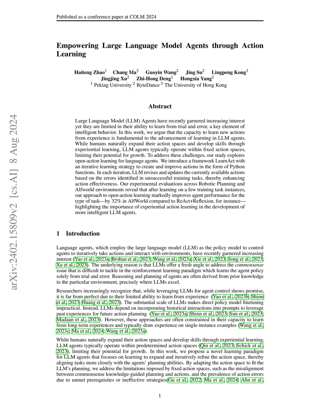 Large Language Model (LLM) Agents have recently garnered increasing interest yet they are limited in their ability to learn from trial and error, a key element of intelligent behavior. In this work, we argue that the capacity to learn new actions from experience is fundamental to the advancement of learning in LLM agents. While humans naturally expand their action spaces and develop skills through experiential learning, LLM agents typically operate within fixed action spaces, limiting their potential for growth. To address these challenges, our study explores open-action learning for language agents. We introduce a framework LearnAct with an iterative learning strategy to create and improve actions in the form of Python functions. In each iteration, LLM revises and updates the currently available actions based on the errors identified in unsuccessful training tasks, thereby enhancing action effectiveness. Our experimental evaluations across Robotic Planning and Alfworld environments reveal that after learning on a few training task instances, our approach to open-action learning markedly improves agent performance for the type of task (by 32 percent in AlfWorld compared to ReAct+Reflexion, for instance) highlighting the importance of experiential action learning in the development of more intelligent LLM agents.