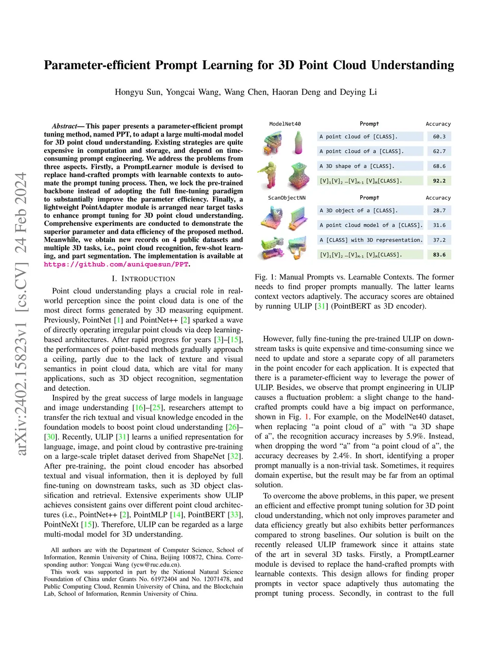 This paper presents a parameter-efficient prompt tuning method, named PPT, to adapt a large multi-modal model for 3D point cloud understanding. Existing strategies are quite expensive in computation and storage, and depend on time-consuming prompt engineering. We address the problems from three aspects. Firstly, a PromptLearner module is devised to replace hand-crafted prompts with learnable contexts to automate the prompt tuning process. Then, we lock the pre-trained backbone instead of adopting the full fine-tuning paradigm to substantially improve the parameter efficiency. Finally, a lightweight PointAdapter module is arranged near target tasks to enhance prompt tuning for 3D point cloud understanding. Comprehensive experiments are conducted to demonstrate the superior parameter and data efficiency of the proposed method.Meanwhile, we obtain new records on 4 public datasets and multiple 3D tasks, i.e., point cloud recognition, few-shot learning, and part segmentation. The implementation is available at https://github.com/auniquesun/PPT.