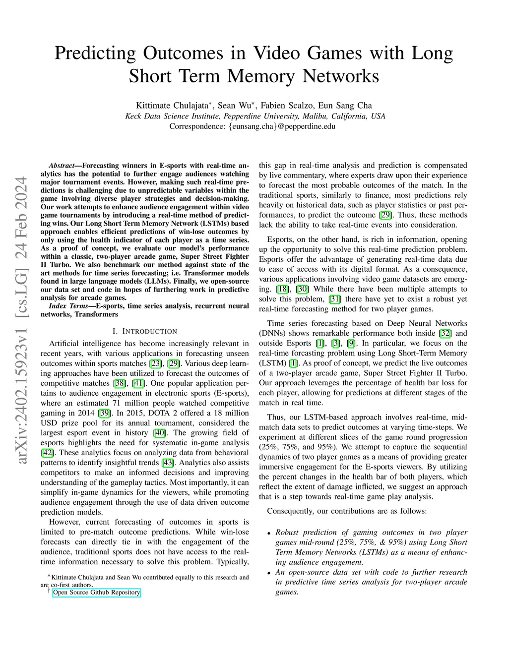 Forecasting winners in E-sports with real-time analytics has the potential to further engage audiences watching major tournament events. However, making such real-time predictions is challenging due to unpredictable variables within the game involving diverse player strategies and decision-making. Our work attempts to enhance audience engagement within video game tournaments by introducing a real-time method of predicting wins. Our Long Short Term Memory Network (LSTMs) based approach enables efficient predictions of win-lose outcomes by only using the health indicator of each player as a time series. As a proof of concept, we evaluate our model's performance within a classic, two-player arcade game, Super Street Fighter II Turbo. We also benchmark our method against state of the art methods for time series forecasting; i.e. Transformer models found in large language models (LLMs). Finally, we open-source our data set and code in hopes of furthering work in predictive analysis for arcade games.