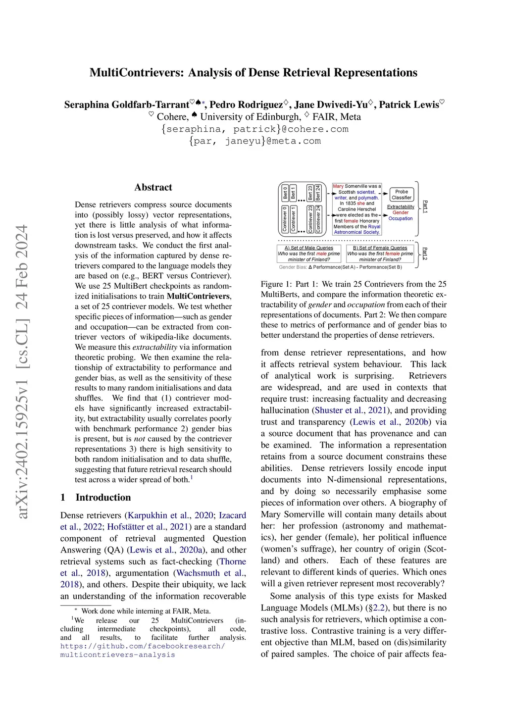 Dense retrievers compress source documents into (possibly lossy) vector representations, yet there is little analysis of what information is lost versus preserved, and how it affects downstream tasks. We conduct the first analysis of the information captured by dense retrievers compared to the language models they are based on (e.g., BERT versus Contriever). We use 25 MultiBert checkpoints as randomized initialisations to train MultiContrievers, a set of 25 contriever models. We test whether specific pieces of information -- such as gender and occupation -- can be extracted from contriever vectors of wikipedia-like documents. We measure this extractability via information theoretic probing. We then examine the relationship of extractability to performance and gender bias, as well as the sensitivity of these results to many random initialisations and data shuffles. We find that (1) contriever models have significantly increased extractability, but extractability usually correlates poorly with benchmark performance 2) gender bias is present, but is not caused by the contriever representations 3) there is high sensitivity to both random initialisation and to data shuffle, suggesting that future retrieval research should test across a wider spread of both.