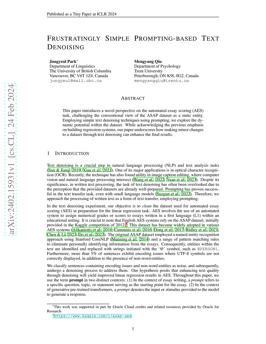 This paper introduces a novel perspective on the automated essay scoring (AES) task, challenging the conventional view of the ASAP dataset as a static entity. Employing simple text denoising techniques using prompting, we explore the dynamic potential within the dataset. While acknowledging the previous emphasis on building regression systems, our paper underscores how making minor changes to a dataset through text denoising can enhance the final results.