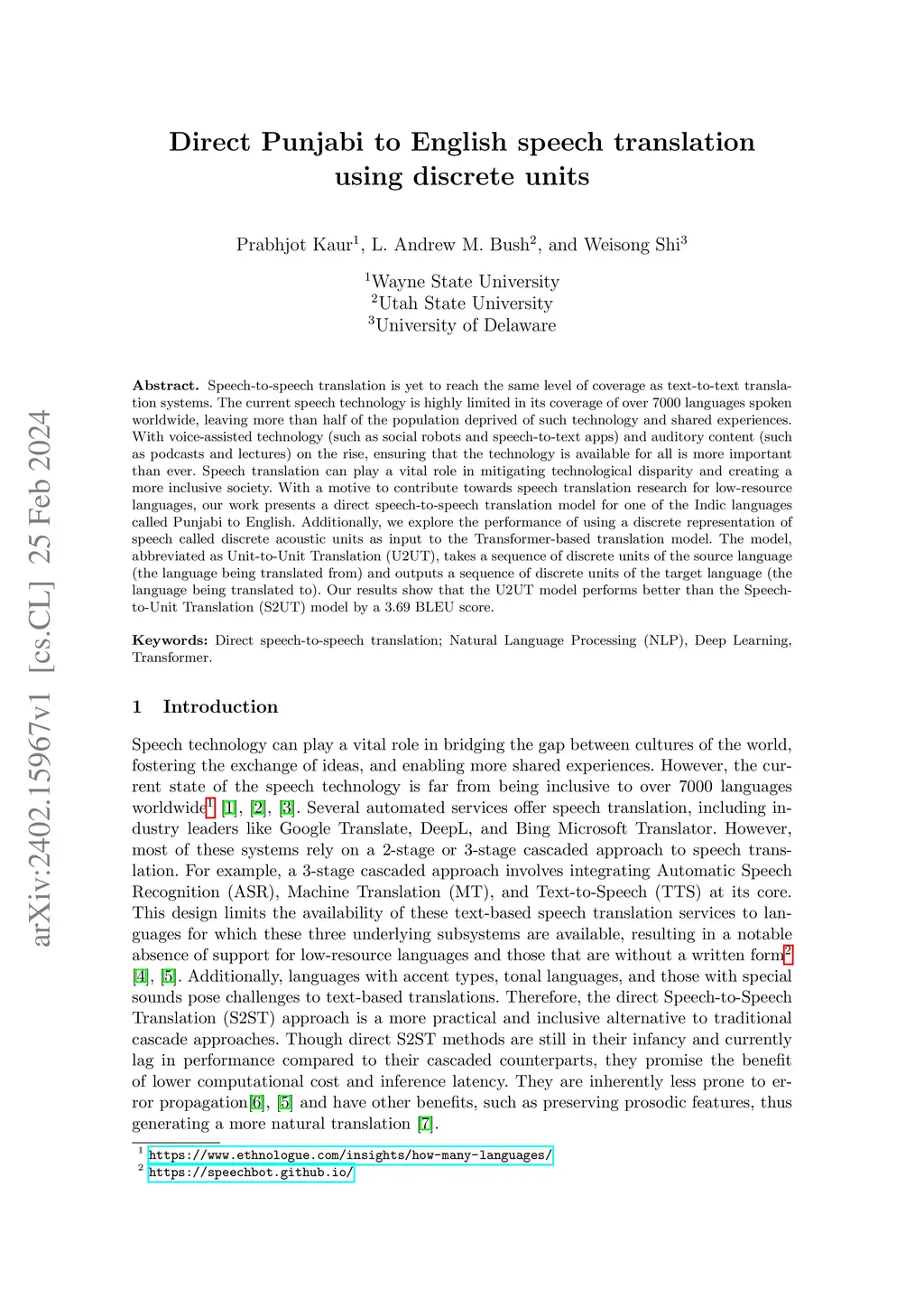 Speech-to-speech translation is yet to reach the same level of coverage as text-to-text translation systems. The current speech technology is highly limited in its coverage of over 7000 languages spoken worldwide, leaving more than half of the population deprived of such technology and shared experiences. With voice-assisted technology (such as social robots and speech-to-text apps) and auditory content (such as podcasts and lectures) on the rise, ensuring that the technology is available for all is more important than ever. Speech translation can play a vital role in mitigating technological disparity and creating a more inclusive society. With a motive to contribute towards speech translation research for low-resource languages, our work presents a direct speech-to-speech translation model for one of the Indic languages called Punjabi to English. Additionally, we explore the performance of using a discrete representation of speech called discrete acoustic units as input to the Transformer-based translation model. The model, abbreviated as Unit-to-Unit Translation (U2UT), takes a sequence of discrete units of the source language (the language being translated from) and outputs a sequence of discrete units of the target language (the language being translated to). Our results show that the U2UT model performs better than the Speech-to-Unit Translation (S2UT) model by a 3.69 BLEU score.