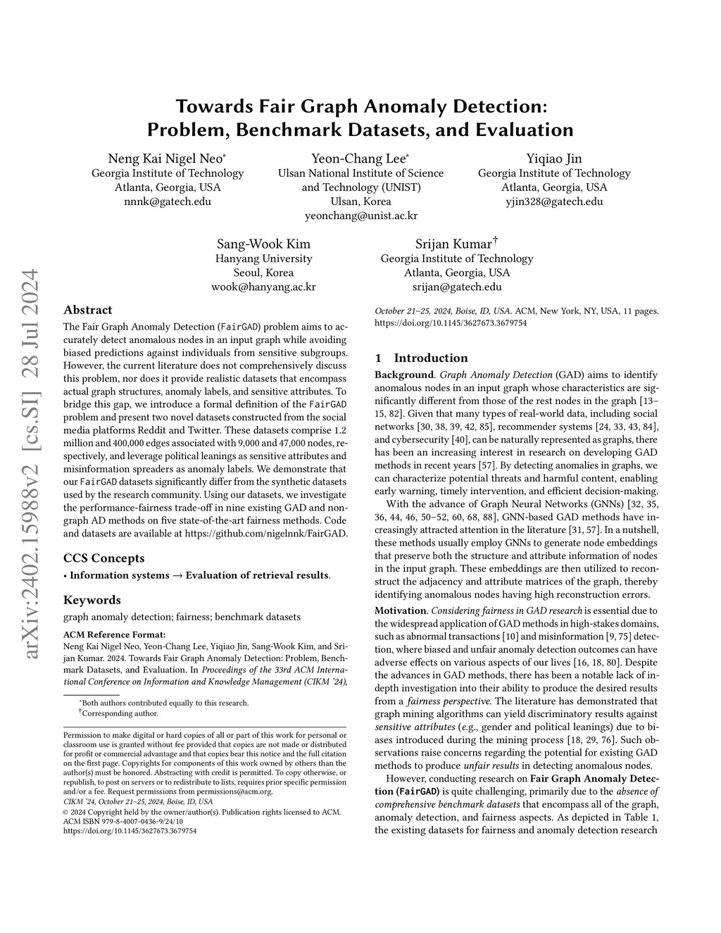 The Fair Graph Anomaly Detection (FairGAD) problem aims to accurately detect anomalous nodes in an input graph while ensuring fairness and avoiding biased predictions against individuals from sensitive subgroups such as gender or political leanings. Fairness in graphs is particularly crucial in anomaly detection areas such as misinformation detection in search/ranking systems, where decision outcomes can significantly affect individuals. However, the current literature does not comprehensively discuss this problem, nor does it provide realistic datasets that encompass actual graph structures, anomaly labels, and sensitive attributes for research in FairGAD. To bridge this gap, we introduce a formal definition of the FairGAD problem and present two novel graph datasets constructed from the globally prominent social media platforms Reddit and Twitter. These datasets comprise 1.2 million and 400,000 edges associated with 9,000 and 47,000 nodes, respectively, and leverage political leanings as sensitive attributes and misinformation spreaders as anomaly labels. We demonstrate that our FairGAD datasets significantly differ from the synthetic datasets used currently by the research community. These new datasets offer significant values for FairGAD by providing realistic data that captures the intricacies of social networks. Using our datasets, we investigate the performance-fairness trade-off in eleven existing GAD and non-graph AD methods on five state-of-the-art fairness methods, which sheds light on their effectiveness and limitations in addressing the FairGAD problem.