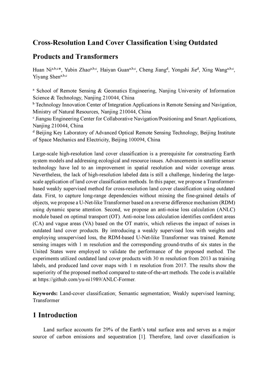 Large-scale high-resolution land cover classification is a prerequisite for constructing Earth system models and addressing ecological and resource issues. Advancements in satellite sensor technology have led to an improvement in spatial resolution and wider coverage areas. Nevertheless, the lack of high-resolution labeled data is still a challenge, hindering the largescale application of land cover classification methods. In this paper, we propose a Transformerbased weakly supervised method for cross-resolution land cover classification using outdated data. First, to capture long-range dependencies without missing the fine-grained details of objects, we propose a U-Net-like Transformer based on a reverse difference mechanism (RDM) using dynamic sparse attention. Second, we propose an anti-noise loss calculation (ANLC) module based on optimal transport (OT). Anti-noise loss calculation identifies confident areas (CA) and vague areas (VA) based on the OT matrix, which relieves the impact of noises in outdated land cover products. By introducing a weakly supervised loss with weights and employing unsupervised loss, the RDM-based U-Net-like Transformer was trained. Remote sensing images with 1 m resolution and the corresponding ground-truths of six states in the United States were employed to validate the performance of the proposed method. The experiments utilized outdated land cover products with 30 m resolution from 2013 as training labels, and produced land cover maps with 1 m resolution from 2017. The results show the superiority of the proposed method compared to state-of-the-art methods. The code is available at https://github.com/yu-ni1989/ANLC-Former.