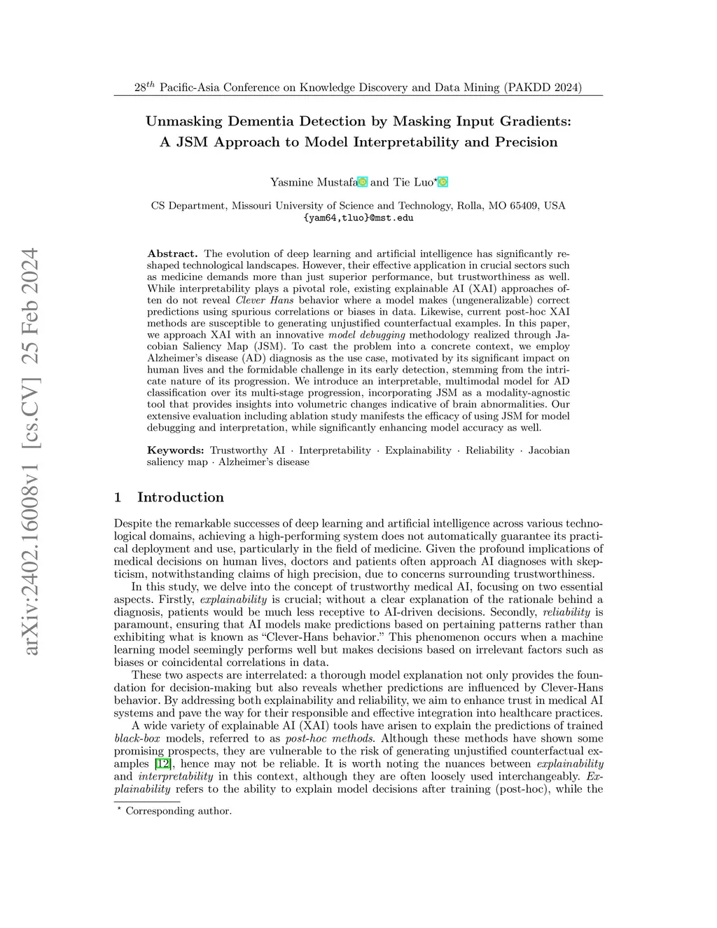 The evolution of deep learning and artificial intelligence has significantly reshaped technological landscapes. However, their effective application in crucial sectors such as medicine demands more than just superior performance, but trustworthiness as well. While interpretability plays a pivotal role, existing explainable AI (XAI) approaches often do not reveal {\em Clever Hans} behavior where a model makes (ungeneralizable) correct predictions using spurious correlations or biases in data. Likewise, current post-hoc XAI methods are susceptible to generating unjustified counterfactual examples. In this paper, we approach XAI with an innovative {\em model debugging} methodology realized through Jacobian Saliency Map (JSM). To cast the problem into a concrete context, we employ Alzheimer's disease (AD) diagnosis as the use case, motivated by its significant impact on human lives and the formidable challenge in its early detection, stemming from the intricate nature of its progression. We introduce an interpretable, multimodal model for AD classification over its multi-stage progression, incorporating JSM as a modality-agnostic tool that provides insights into volumetric changes indicative of brain abnormalities. Our extensive evaluation including ablation study manifests the efficacy of using JSM for model debugging and interpretation, while significantly enhancing model accuracy as well.