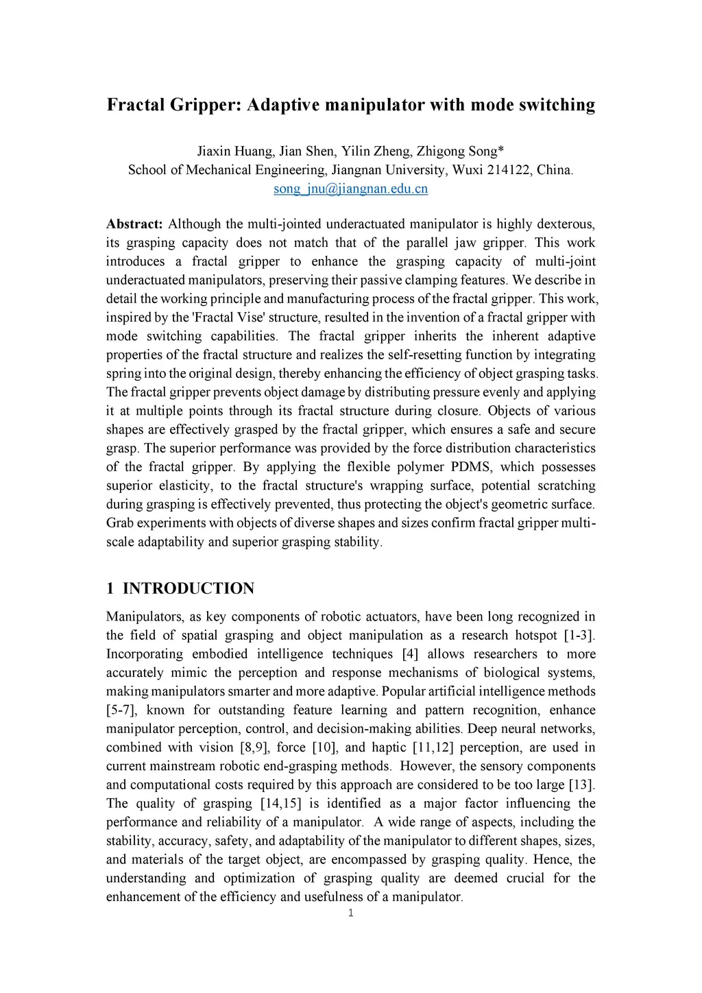 Although the multi-jointed underactuated manipulator is highly dexterous, its grasping capacity does not match that of the parallel jaw gripper. This work introduces a fractal gripper to enhance the grasping capacity of multi-joint underactuated manipulators, preserving their passive clamping features. We describe in detail the working principle and manufacturing process of the fractal gripper. This work, inspired by the 'Fractal Vise' structure, resulted in the invention of a fractal gripper with mode switching capabilities. The fractal gripper inherits the inherent adaptive properties of the fractal structure and realizes the self-resetting function by integrating spring into the original design, thereby enhancing the efficiency of object grasping tasks. The fractal gripper prevents object damage by distributing pressure evenly and applying it at multiple points through its fractal structure during closure. Objects of various shapes are effectively grasped by the fractal gripper, which ensures a safe and secure grasp. The superior performance was provided by the force distribution characteristics of the fractal gripper. By applying the flexible polymer PDMS, which possesses superior elasticity, to the fractal structure's wrapping surface, potential scratching during grasping is effectively prevented, thus protecting the object's geometric surface. Grab experiments with objects of diverse shapes and sizes confirm fractal gripper multi-scale adaptability and superior grasping stability.