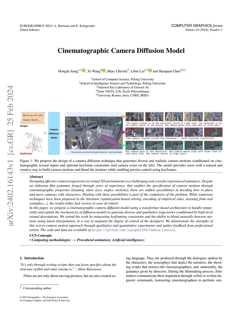 Designing effective camera trajectories in virtual 3D environments is a challenging task even for experienced animators. Despite an elaborate film grammar, forged through years of experience, that enables the specification of camera motions through cinematographic properties (framing, shots sizes, angles, motions), there are endless possibilities in deciding how to place and move cameras with characters. Dealing with these possibilities is part of the complexity of the problem. While numerous techniques have been proposed in the literature (optimization-based solving, encoding of empirical rules, learning from real examples,...), the results either lack variety or ease of control. In this paper, we propose a cinematographic camera diffusion model using a transformer-based architecture to handle temporality and exploit the stochasticity of diffusion models to generate diverse and qualitative trajectories conditioned by high-level textual descriptions. We extend the work by integrating keyframing constraints and the ability to blend naturally between motions using latent interpolation, in a way to augment the degree of control of the designers. We demonstrate the strengths of this text-to-camera motion approach through qualitative and quantitative experiments and gather feedback from professional artists. The code and data are available at \URL{https://github.com/jianghd1996/Camera-control}.