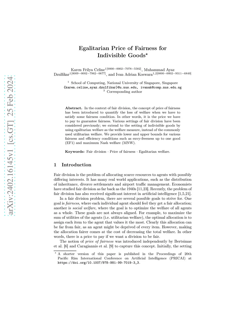 In the context of fair division, the concept of price of fairness has been introduced to quantify the loss of welfare when we have to satisfy some fairness condition. In other words, it is the price we have to pay to guarantee fairness. Various settings of fair division have been considered previously; we extend to the setting of indivisible goods by using egalitarian welfare as the welfare measure, instead of the commonly used utilitarian welfare. We provide lower and upper bounds for various fairness and efficiency conditions such as envy-freeness up to one good (EF1) and maximum Nash welfare (MNW).