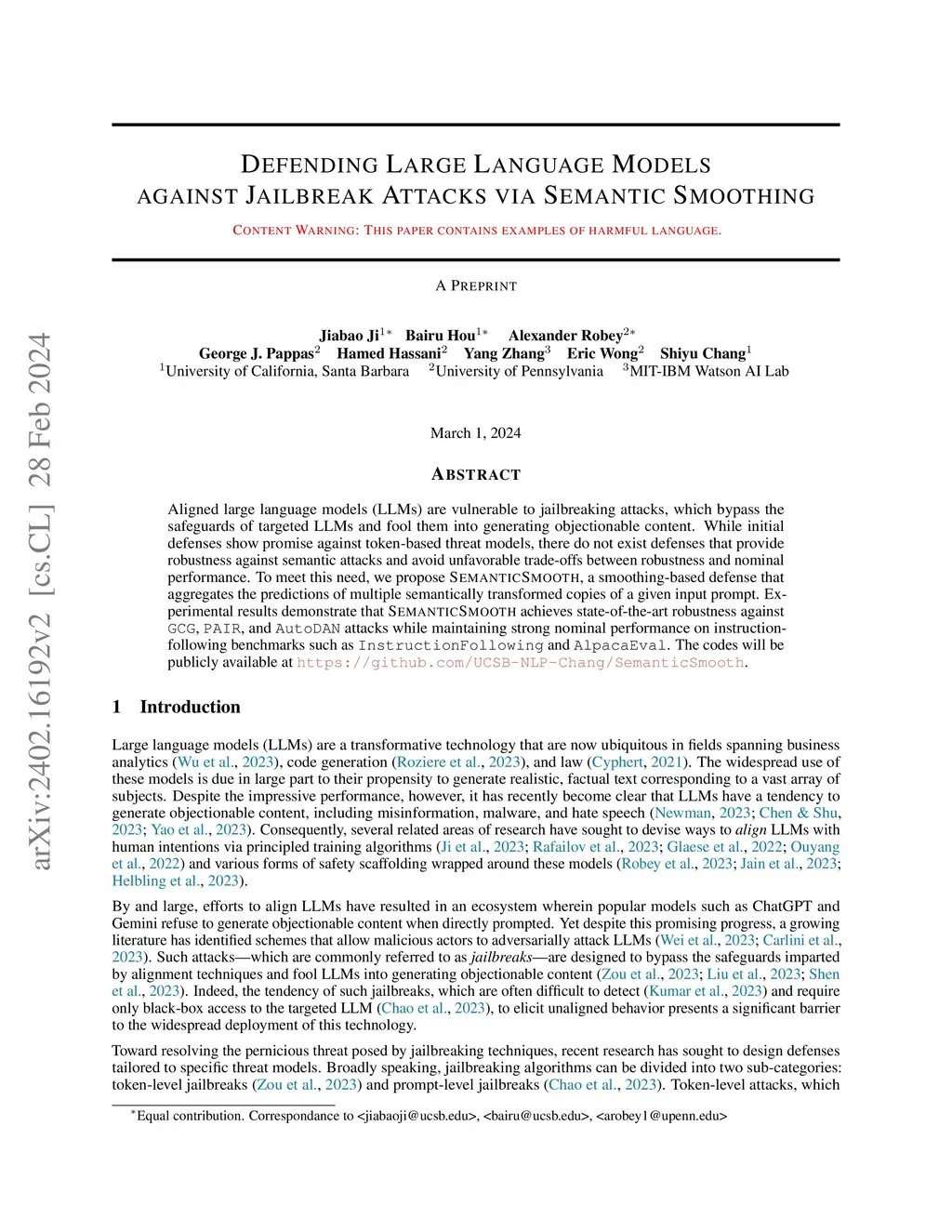 Defending Large Language Models against Jailbreak Attacks via Semantic Smoothing